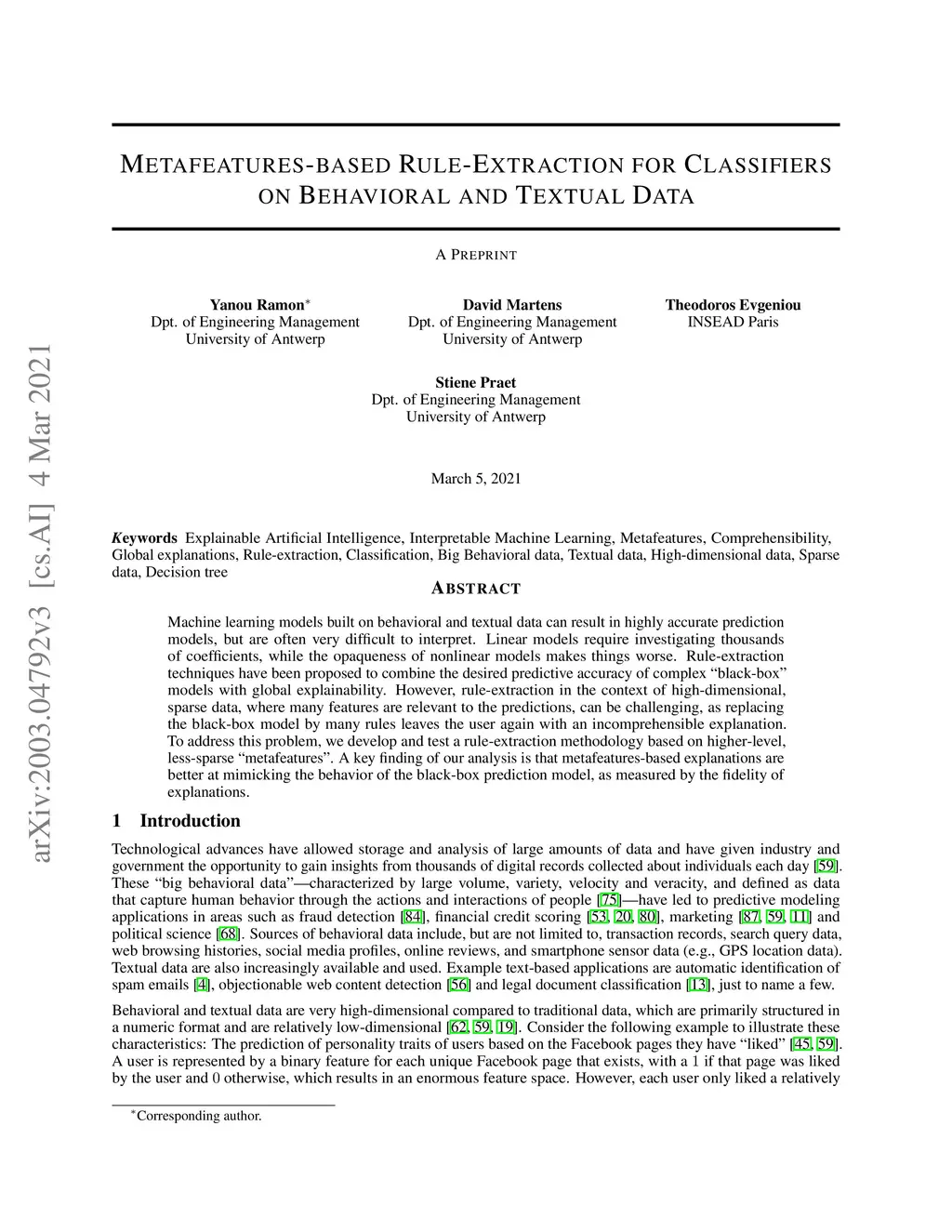 Machine learning models on behavioral and textual data can result in highly accurate prediction models, but are often very difficult to interpret. Rule-extraction techniques have been proposed to combine the desired predictive accuracy of complex "black-box" models with global explainability. However, rule-extraction in the context of high-dimensional, sparse data, where many features are relevant to the predictions, can be challenging, as replacing the black-box model by many rules leaves the user again with an incomprehensible explanation. To address this problem, we develop and test a rule-extraction methodology based on higher-level, less-sparse metafeatures. A key finding of our analysis is that metafeatures-based explanations are better at mimicking the behavior of the black-box prediction model, as measured by the fidelity of explanations.