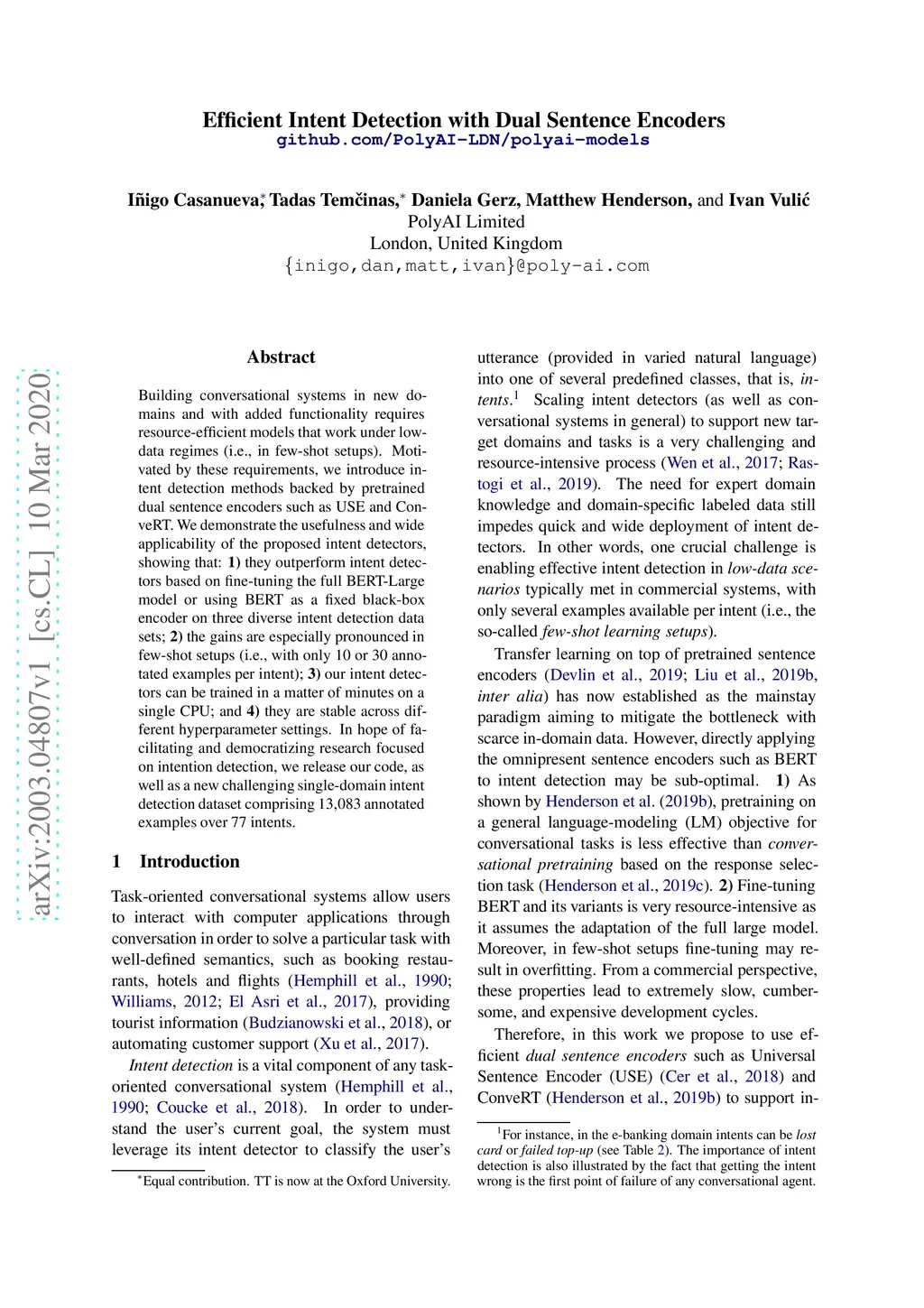 Building conversational systems in new domains and with added functionality requires resource-efficient models that work under low-data regimes (i.e., in few-shot setups). Motivated by these requirements, we introduce intent detection methods backed by pretrained dual sentence encoders such as USE and ConveRT. We demonstrate the usefulness and wide applicability of the proposed intent detectors, showing that: 1) they outperform intent detectors based on fine-tuning the full BERT-Large model or using BERT as a fixed black-box encoder on three diverse intent detection data sets; 2) the gains are especially pronounced in few-shot setups (i.e., with only 10 or 30 annotated examples per intent); 3) our intent detectors can be trained in a matter of minutes on a single CPU; and 4) they are stable across different hyperparameter settings. In hope of facilitating and democratizing research focused on intention detection, we release our code, as well as a new challenging single-domain intent detection dataset comprising 13,083 annotated examples over 77 intents.