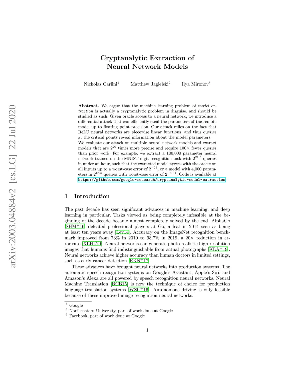 We argue that the machine learning problem of model extraction is actually a cryptanalytic problem in disguise, and should be studied as such. Given oracle access to a neural network, we introduce a differential attack that can efficiently steal the parameters of the remote model up to floating point precision. Our attack relies on the fact that ReLU neural networks are piecewise linear functions, and thus queries at the critical points reveal information about the model parameters. We evaluate our attack on multiple neural network models and extract models that are 2^20 times more precise and require 100x fewer queries than prior work. For example, we extract a 100,000 parameter neural network trained on the MNIST digit recognition task with 2^21.5 queries in under an hour, such that the extracted model agrees with the oracle on all inputs up to a worst-case error of 2^-25, or a model with 4,000 parameters in 2^18.5 queries with worst-case error of 2^-40.4. Code is available at https://github.com/google-research/cryptanalytic-model-extraction.