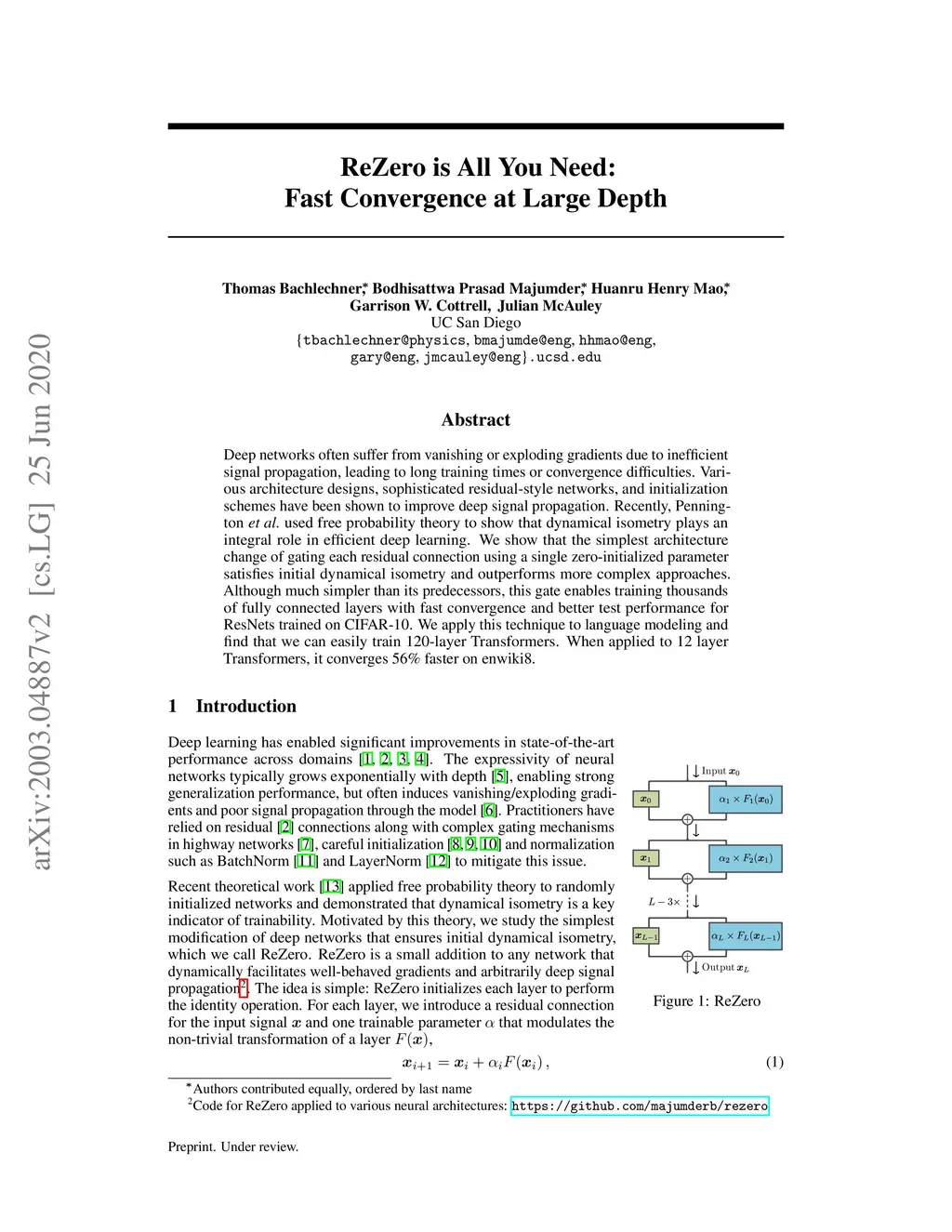 Deep networks often suffer from vanishing or exploding gradients due to inefficient signal propagation, leading to long training times or convergence difficulties. Various architecture designs, sophisticated residual-style networks, and initialization schemes have been shown to improve deep signal propagation. Recently, Pennington et al. used free probability theory to show that dynamical isometry plays an integral role in efficient deep learning. We show that the simplest architecture change of gating each residual connection using a single zero-initialized parameter satisfies initial dynamical isometry and outperforms more complex approaches. Although much simpler than its predecessors, this gate enables training thousands of fully connected layers with fast convergence and better test performance for ResNets trained on CIFAR-10. We apply this technique to language modeling and find that we can easily train 120-layer Transformers. When applied to 12 layer Transformers, it converges 56% faster on enwiki8.