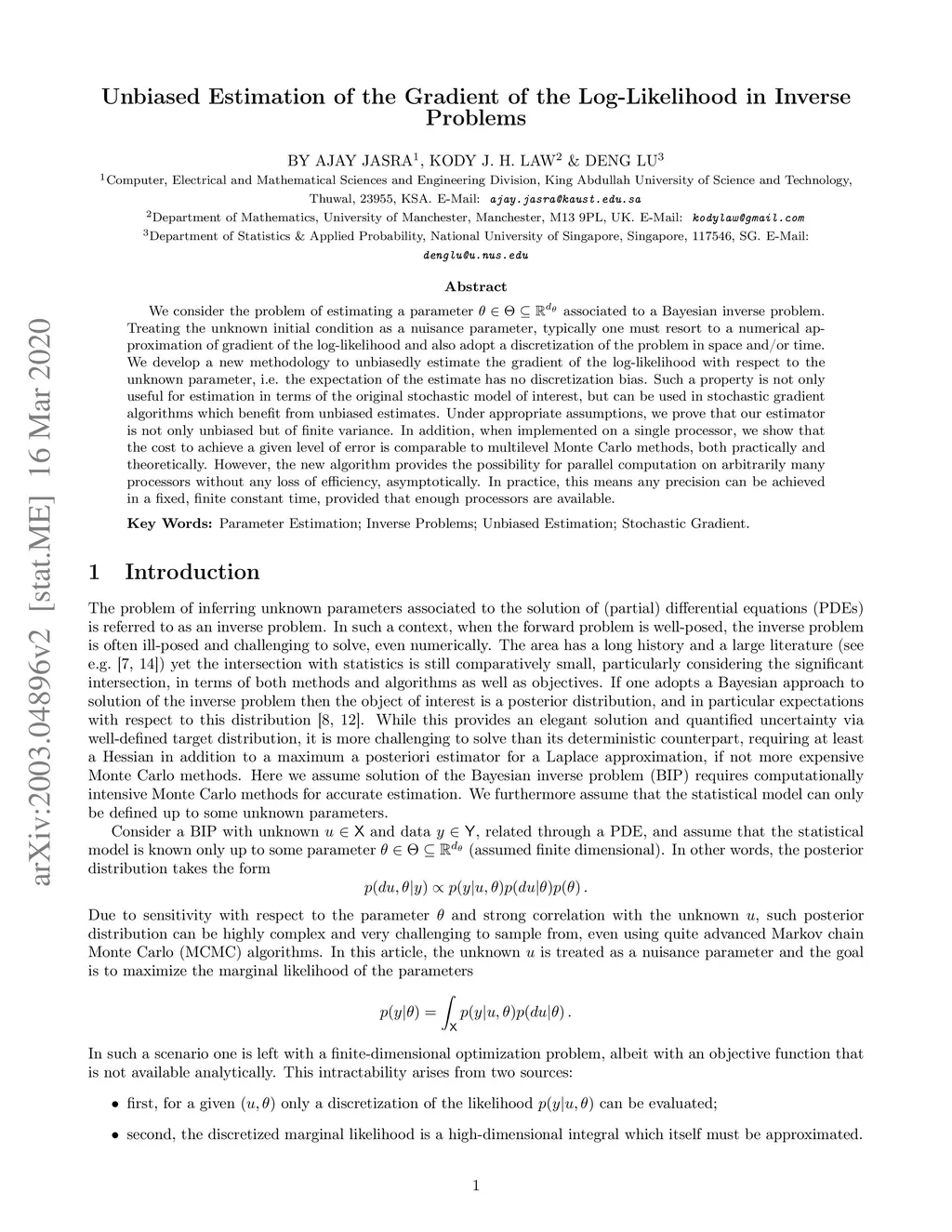 We consider the problem of estimating a parameter associated to a Bayesian inverse problem. Treating the unknown initial condition as a nuisance parameter, typically one must resort to a numerical approximation of gradient of the log-likelihood and also adopt a discretization of the problem in space and/or time. We develop a new methodology to unbiasedly estimate the gradient of the log-likelihood with respect to the unknown parameter, i.e. the expectation of the estimate has no discretization bias. Such a property is not only useful for estimation in terms of the original stochastic model of interest, but can be used in stochastic gradient algorithms which benefit from unbiased estimates. Under appropriate assumptions, we prove that our estimator is not only unbiased but of finite variance. In addition, when implemented on a single processor, we show that the cost to achieve a given level of error is comparable to multilevel Monte Carlo methods, both practically and theoretically. However, the new algorithm provides the possibility for parallel computation on arbitrarily many processors without any loss of efficiency, asymptotically. In practice, this means any precision can be achieved in a fixed, finite constant time, provided that enough processors are available.
