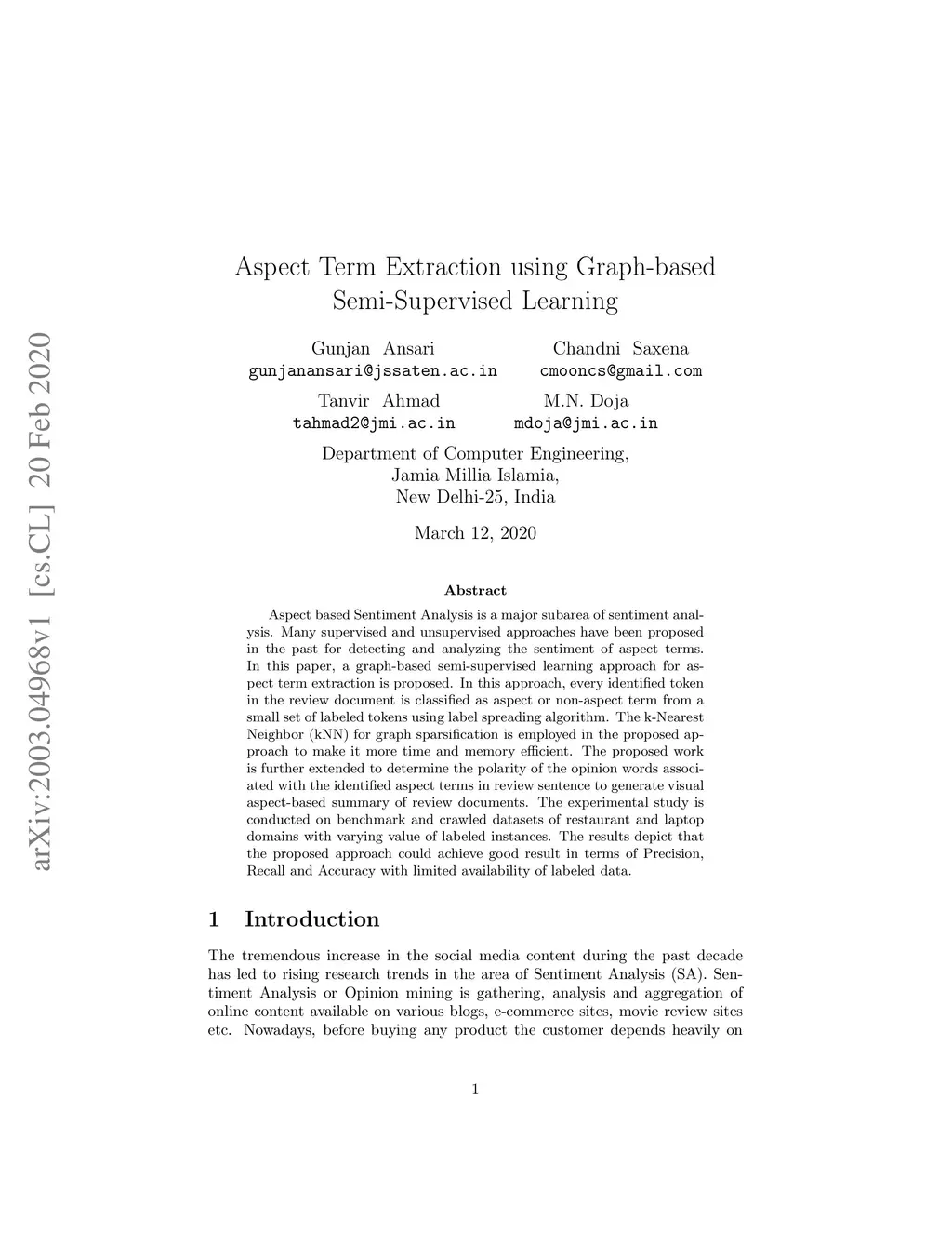 Aspect Term Extraction using Graph-based Semi-Supervised Learning