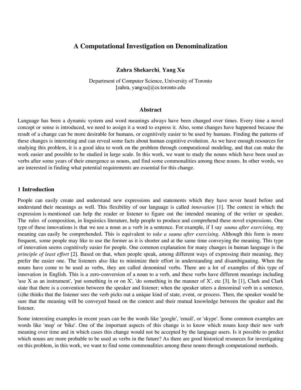Language has been a dynamic system and word meanings always have been changed over times. Every time a novel concept or sense is introduced, we need to assign it a word to express it. Also, some changes have happened because the result of a change can be more desirable for humans, or cognitively easier to be used by humans. Finding the patterns of these changes is interesting and can reveal some facts about human cognitive evolution. As we have enough resources for studying this problem, it is a good idea to work on the problem through computational modeling, and that can make the work easier and possible to be studied on large scale. In this work, we want to study the nouns which have been used as verbs after some years of their emergence as nouns and find some commonalities among these nouns. In other words, we are interested in finding what potential requirements are essential for this change.