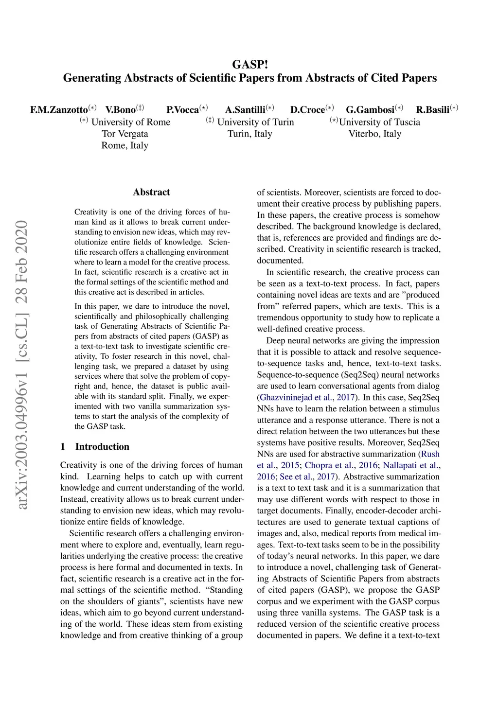 Creativity is one of the driving forces of human kind as it allows to break current understanding to envision new ideas, which may revolutionize entire fields of knowledge. Scientific research offers a challenging environment where to learn a model for the creative process. In fact, scientific research is a creative act in the formal settings of the scientific method and this creative act is described in articles. In this paper, we dare to introduce the novel, scientifically and philosophically challenging task of Generating Abstracts of Scientific Papers from abstracts of cited papers (GASP) as a text-to-text task to investigate scientific creativity, To foster research in this novel, challenging task, we prepared a dataset by using services where that solve the problem of copyright and, hence, the dataset is public available with its standard split. Finally, we experimented with two vanilla summarization systems to start the analysis of the complexity of the GASP task.