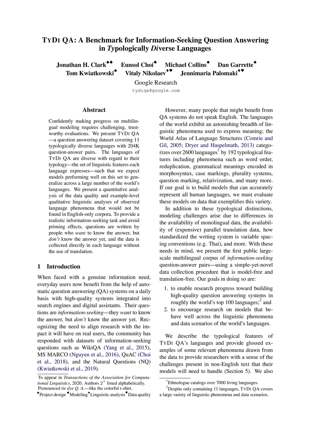 TyDi QA: A Benchmark for Information-Seeking Question Answering in