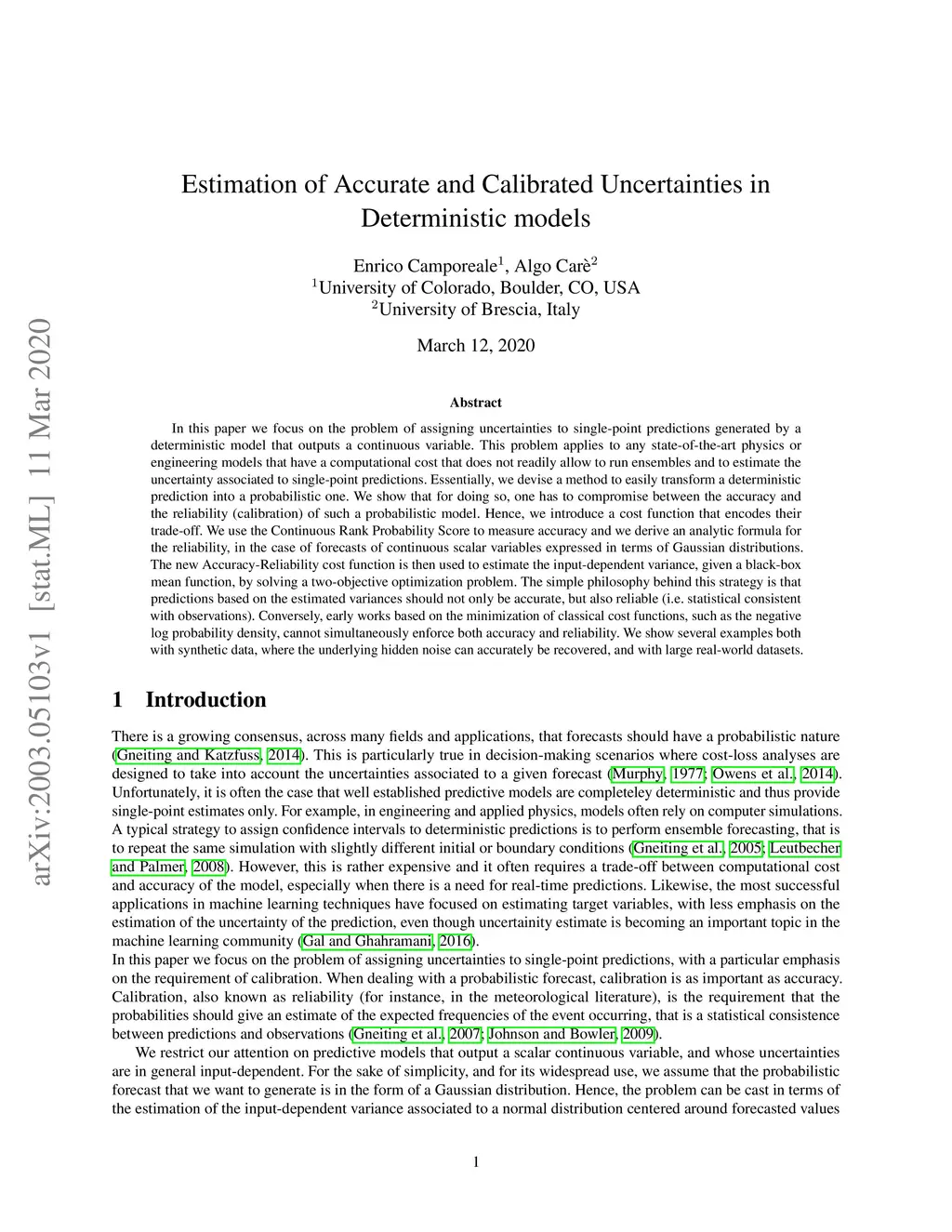 In this paper we focus on the problem of assigning uncertainties to single-point predictions generated by a deterministic model that outputs a continuous variable. This problem applies to any state-of-the-art physics or engineering models that have a computational cost that does not readily allow to run ensembles and to estimate the uncertainty associated to single-point predictions. Essentially, we devise a method to easily transform a deterministic prediction into a probabilistic one. We show that for doing so, one has to compromise between the accuracy and the reliability (calibration) of such a probabilistic model. Hence, we introduce a cost function that encodes their trade-off. We use the Continuous Rank Probability Score to measure accuracy and we derive an analytic formula for the reliability, in the case of forecasts of continuous scalar variables expressed in terms of Gaussian distributions. The new Accuracy-Reliability cost function is then used to estimate the input-dependent variance, given a black-box mean function, by solving a two-objective optimization problem. The simple philosophy behind this strategy is that predictions based on the estimated variances should not only be accurate, but also reliable (i.e. statistical consistent with observations). Conversely, early works based on the minimization of classical cost functions, such as the negative log probability density, cannot simultaneously enforce both accuracy and reliability. We show several examples both with synthetic data, where the underlying hidden noise can accurately be recovered, and with large real-world datasets.