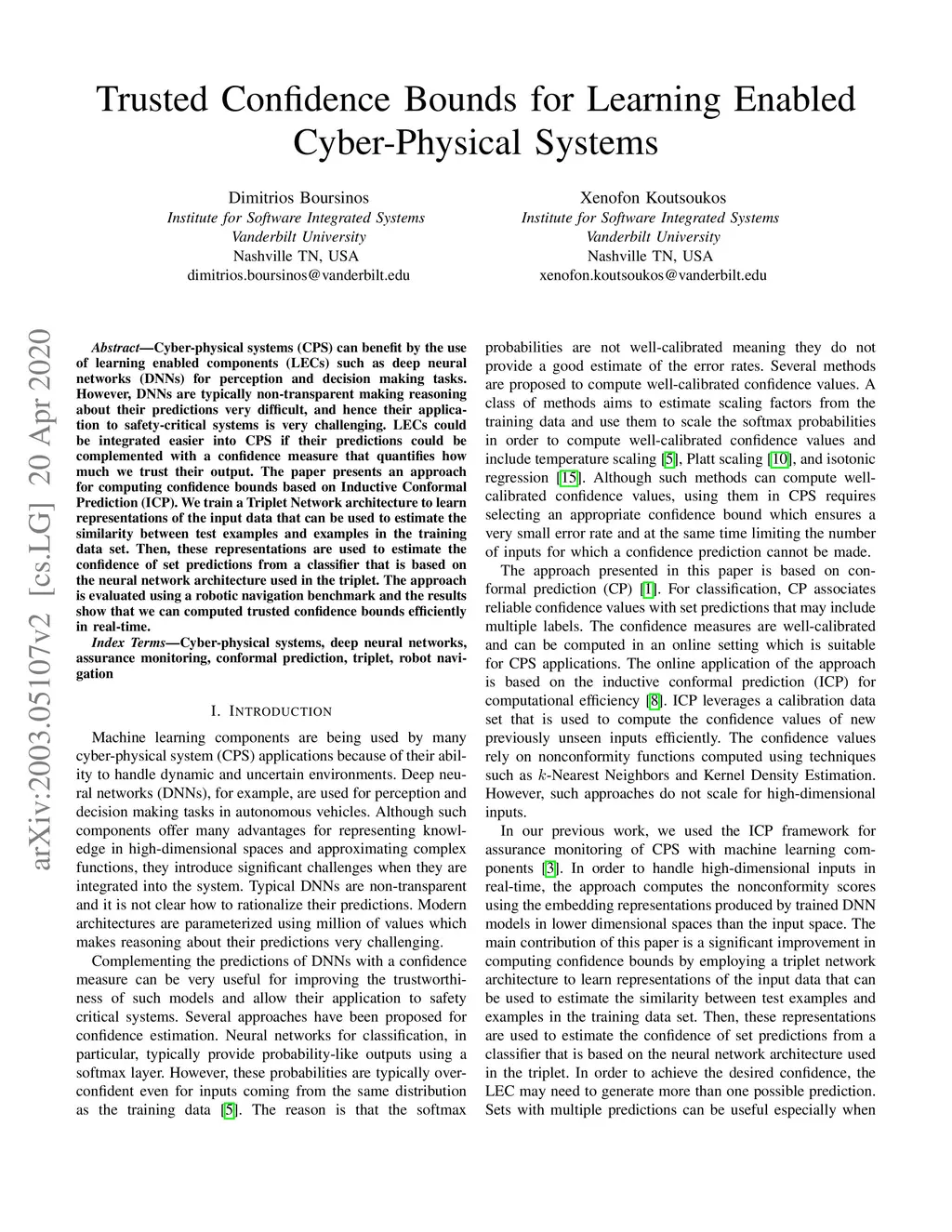 Cyber-physical systems (CPS) can benefit by the use of learning enabled components (LECs) such as deep neural networks (DNNs) for perception and decision making tasks. However, DNNs are typically non-transparent making reasoning about their predictions very difficult, and hence their application to safety-critical systems is very challenging. LECs could be integrated easier into CPS if their predictions could be complemented with a confidence measure that quantifies how much we trust their output. The paper presents an approach for computing confidence bounds based on Inductive Conformal Prediction (ICP). We train a Triplet Network architecture to learn representations of the input data that can be used to estimate the similarity between test examples and examples in the training data set. Then, these representations are used to estimate the confidence of set predictions from a classifier that is based on the neural network architecture used in the triplet. The approach is evaluated using a robotic navigation benchmark and the results show that we can computed trusted confidence bounds efficiently in real-time.
