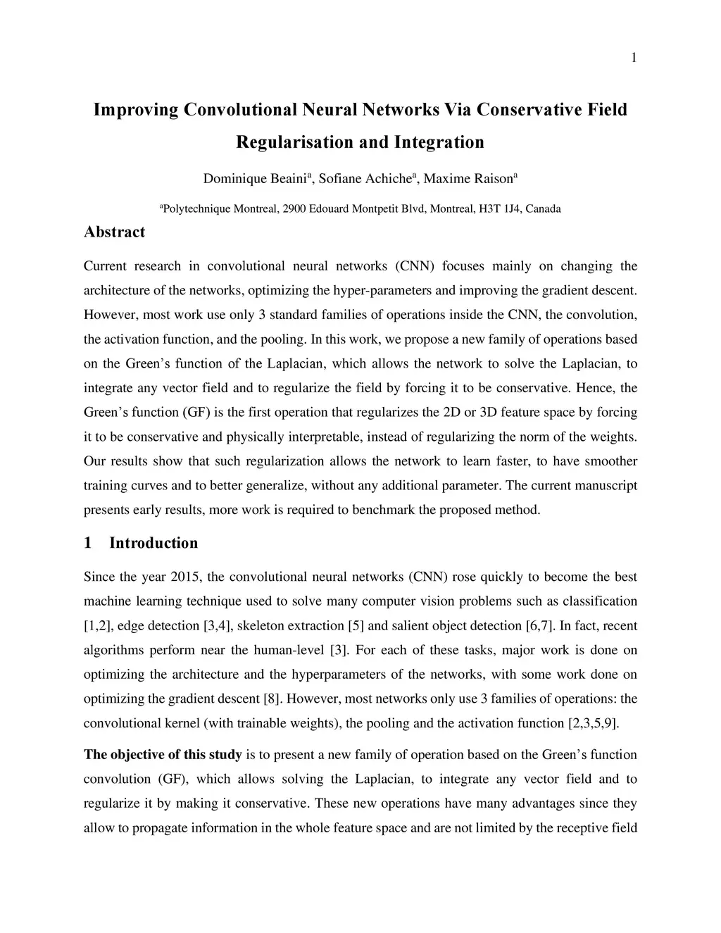 Current research in convolutional neural networks (CNN) focuses mainly on changing the architecture of the networks, optimizing the hyper-parameters and improving the gradient descent. However, most work use only 3 standard families of operations inside the CNN, the convolution, the activation function, and the pooling. In this work, we propose a new family of operations based on the Green's function of the Laplacian, which allows the network to solve the Laplacian, to integrate any vector field and to regularize the field by forcing it to be conservative. Hence, the Green's function (GF) is the first operation that regularizes the 2D or 3D feature space by forcing it to be conservative and physically interpretable, instead of regularizing the norm of the weights. Our results show that such regularization allows the network to learn faster, to have smoother training curves and to better generalize, without any additional parameter. The current manuscript presents early results, more work is required to benchmark the proposed method.