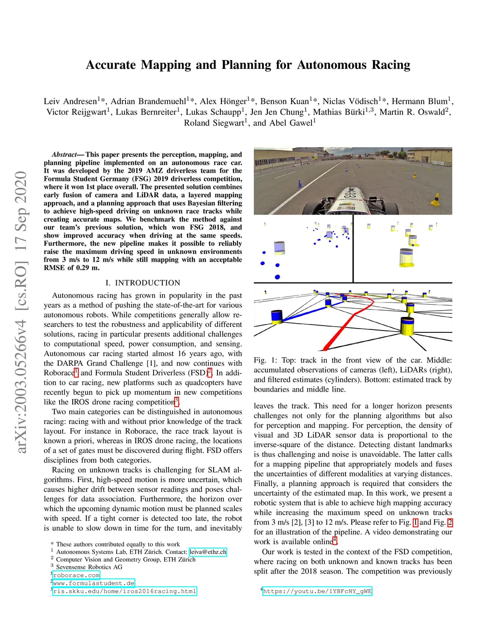 This paper presents the perception, mapping, and planning pipeline implemented on an autonomous race car. It was developed by the 2019 AMZ driverless team for the Formula Student Germany (FSG) 2019 driverless competition, where it won 1st place overall. The presented solution combines early fusion of camera and LiDAR data, a layered mapping approach, and a planning approach that uses Bayesian filtering to achieve high-speed driving on unknown race tracks while creating accurate maps. We benchmark the method against our team's previous solution, which won FSG 2018, and show improved accuracy when driving at the same speeds. Furthermore, the new pipeline makes it possible to reliably raise the maximum driving speed in unknown environments from 3~m/s to 12~m/s while still mapping with an acceptable RMSE of 0.29~m.
