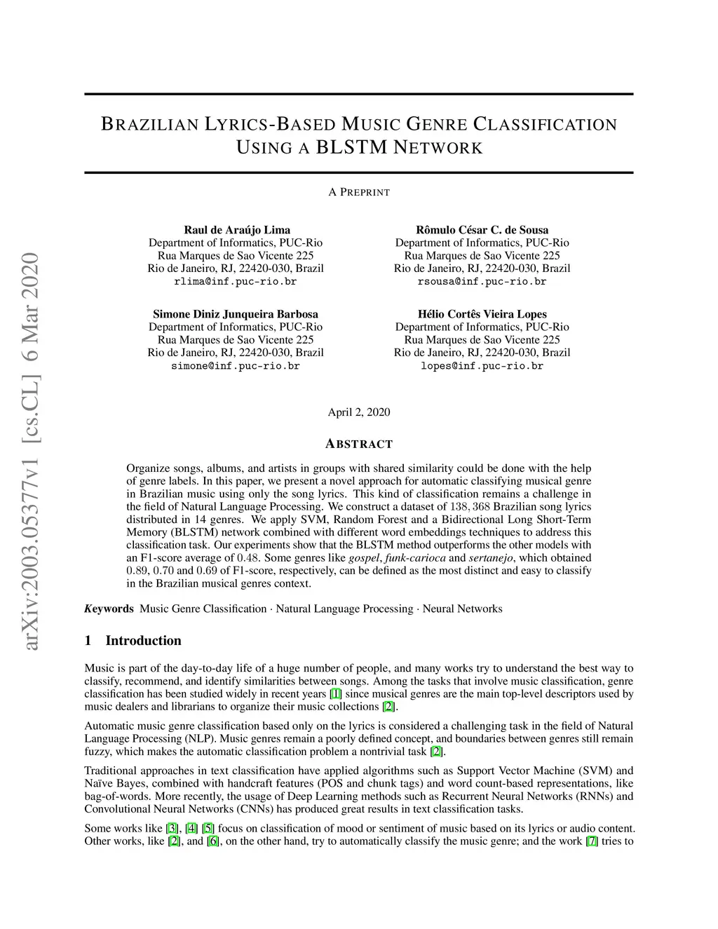 Brazilian Lyrics-Based Music Genre Classification Using a BLSTM Network