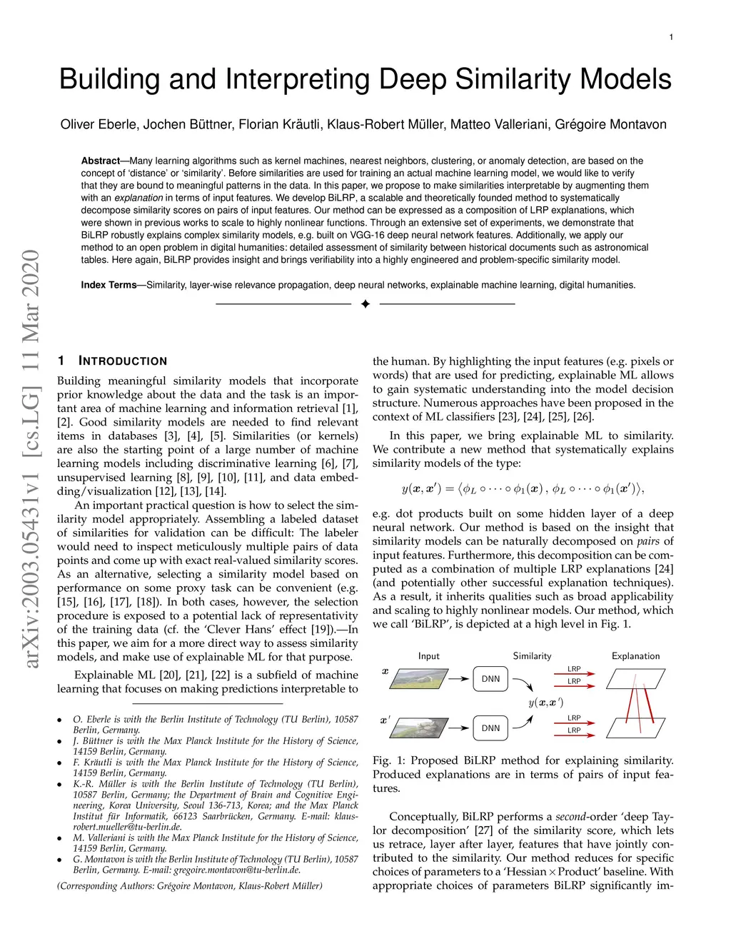 Many learning algorithms such as kernel machines, nearest neighbors, clustering, or anomaly detection, are based on the concept of 'distance' or 'similarity'. Before similarities are used for training an actual machine learning model, we would like to verify that they are bound to meaningful patterns in the data. In this paper, we propose to make similarities interpretable by augmenting them with an explanation in terms of input features. We develop BiLRP, a scalable and theoretically founded method to systematically decompose similarity scores on pairs of input features. Our method can be expressed as a composition of LRP explanations, which were shown in previous works to scale to highly nonlinear functions. Through an extensive set of experiments, we demonstrate that BiLRP robustly explains complex similarity models, e.g. built on VGG-16 deep neural network features. Additionally, we apply our method to an open problem in digital humanities: detailed assessment of similarity between historical documents such as astronomical tables. Here again, BiLRP provides insight and brings verifiability into a highly engineered and problem-specific similarity model.