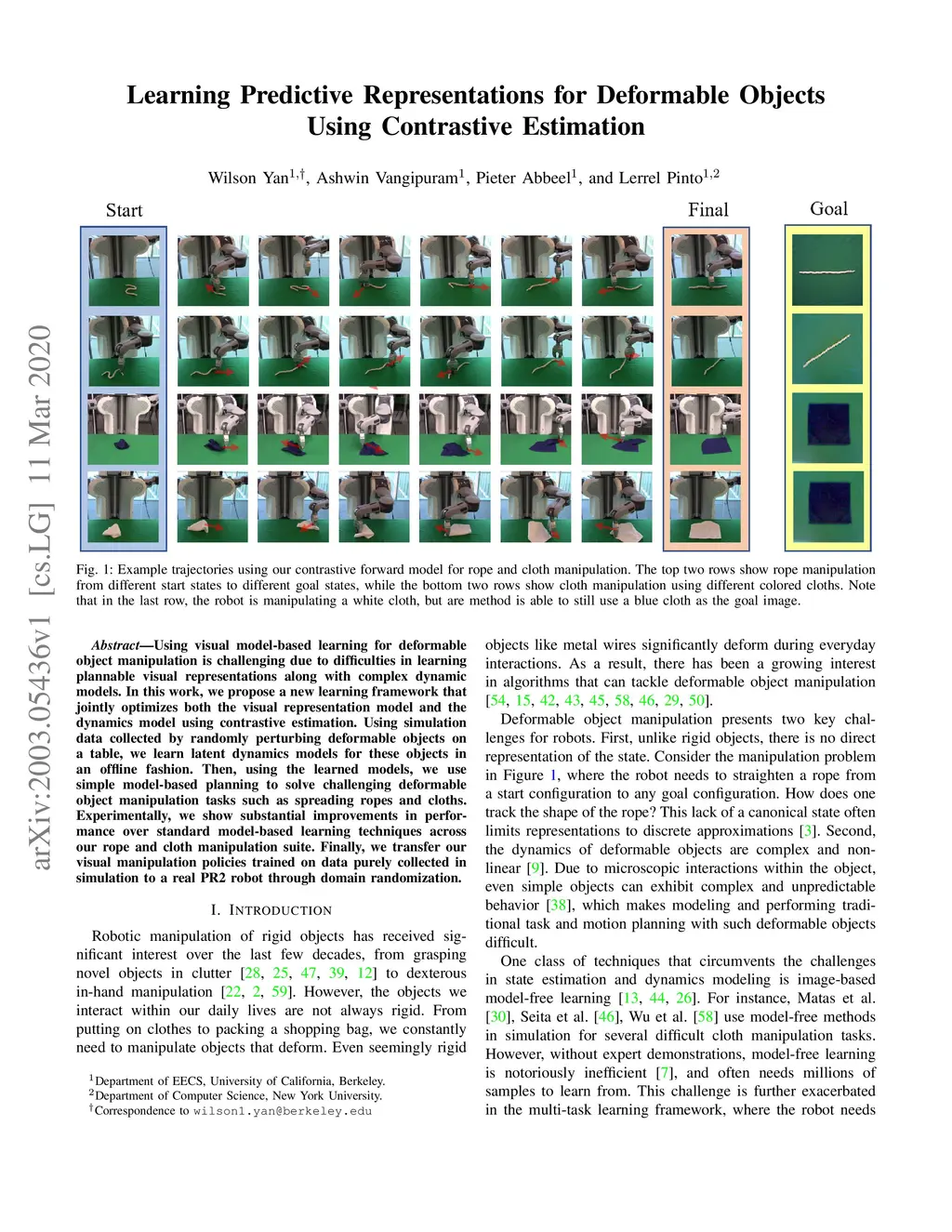 Using visual model-based learning for deformable object manipulation is challenging due to difficulties in learning plannable visual representations along with complex dynamic models. In this work, we propose a new learning framework that jointly optimizes both the visual representation model and the dynamics model using contrastive estimation. Using simulation data collected by randomly perturbing deformable objects on a table, we learn latent dynamics models for these objects in an offline fashion. Then, using the learned models, we use simple model-based planning to solve challenging deformable object manipulation tasks such as spreading ropes and cloths. Experimentally, we show substantial improvements in performance over standard model-based learning techniques across our rope and cloth manipulation suite. Finally, we transfer our visual manipulation policies trained on data purely collected in simulation to a real PR2 robot through domain randomization.