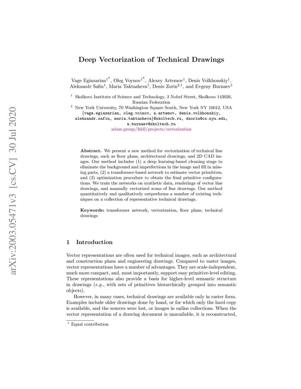 We present a new method for vectorization of technical line drawings, such as floor plans, architectural drawings, and 2D CAD images. Our method includes (1) a deep learning-based cleaning stage to eliminate the background and imperfections in the image and fill in missing parts, (2) a transformer-based network to estimate vector primitives, and (3) optimization procedure to obtain the final primitive configurations. We train the networks on synthetic data, renderings of vector line drawings, and manually vectorized scans of line drawings. Our method quantitatively and qualitatively outperforms a number of existing techniques on a collection of representative technical drawings.
