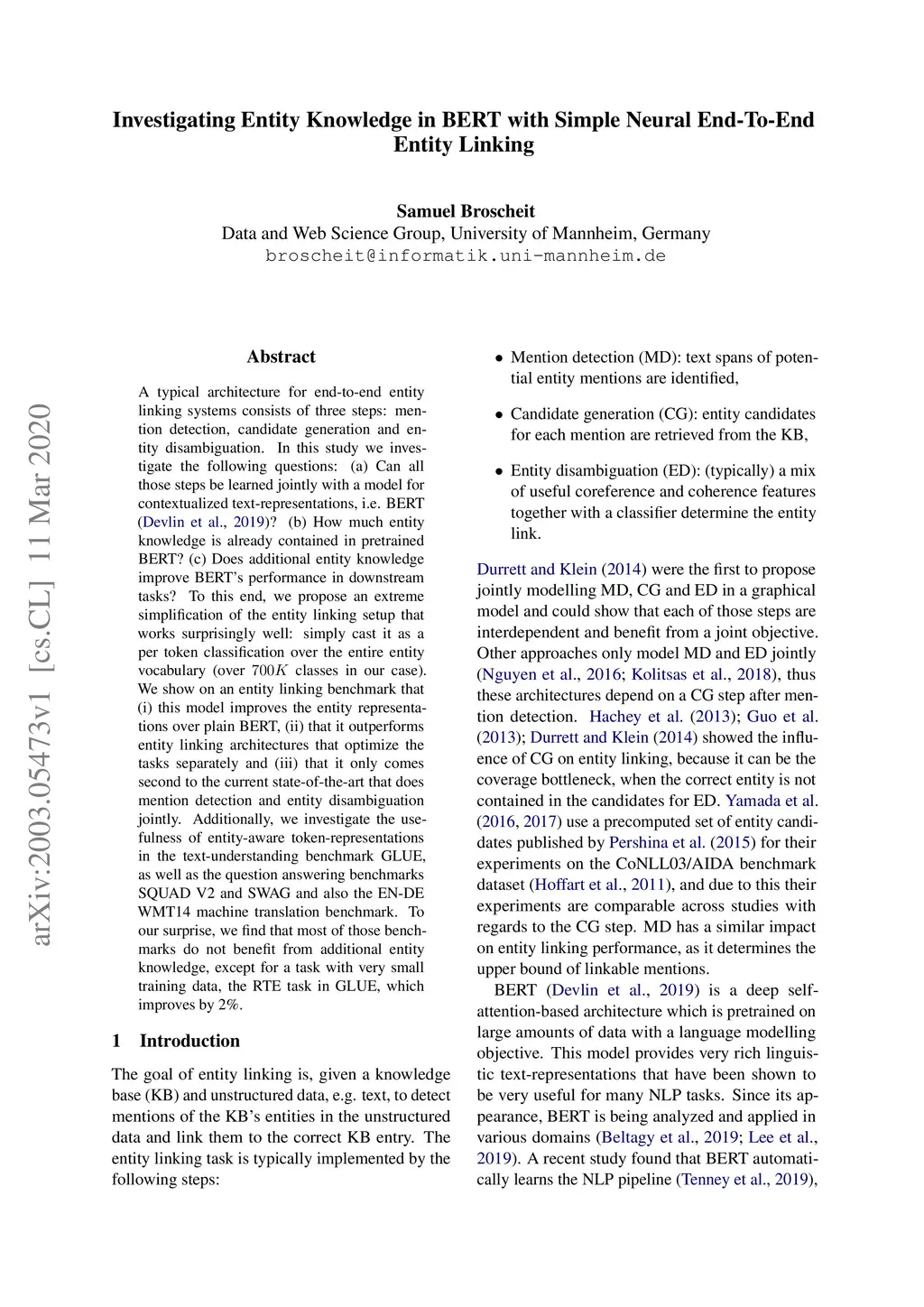 Investigating Entity Knowledge in BERT with Simple Neural End-To-End