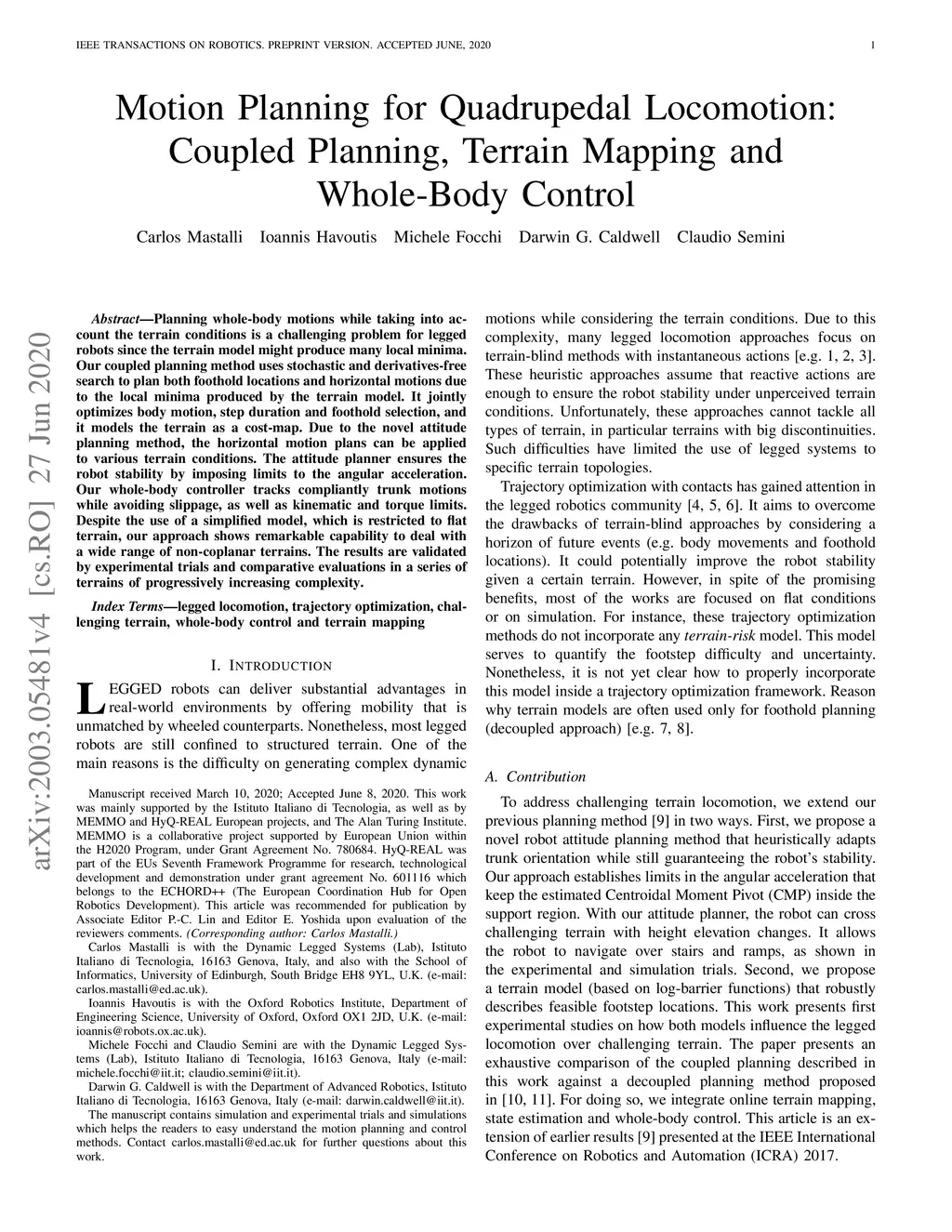 Motion Planning for Quadrupedal Locomotion: Coupled Planning, Terrain
