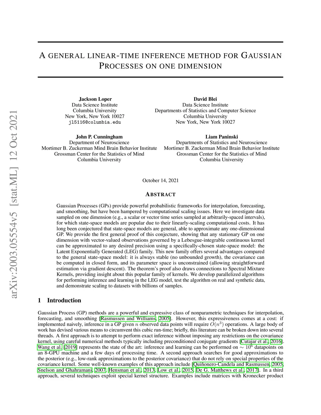 Gaussian Processes (GPs) provide powerful probabilistic frameworks for interpolation, forecasting, and smoothing, but have been hampered by computational scaling issues. Here we investigate data sampled on one dimension (e.g., a scalar or vector time series sampled at arbitrarily-spaced intervals), for which state-space models are popular due to their linearly-scaling computational costs. It has long been conjectured that state-space models are general, able to approximate any one-dimensional GP. We provide the first general proof of this conjecture, showing that any stationary GP on one dimension with vector-valued observations governed by a Lebesgue-integrable continuous kernel can be approximated to any desired precision using a specifically-chosen state-space model: the Latent Exponentially Generated (LEG) family. This new family offers several advantages compared to the general state-space model: it is always stable (no unbounded growth), the covariance can be computed in closed form, and its parameter space is unconstrained (allowing straightforward estimation via gradient descent). The theorem's proof also draws connections to Spectral Mixture Kernels, providing insight about this popular family of kernels. We develop parallelized algorithms for performing inference and learning in the LEG model, test the algorithm on real and synthetic data, and demonstrate scaling to datasets with billions of samples.
