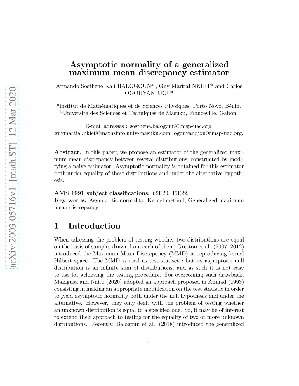 In this paper, we propose an estimator of the generalized maximum mean discrepancy between several distributions, constructed by modifying a naive estimator. Asymptotic normality is obtained for this estimator both under equality of these distributions and under the alternative hypothesis.