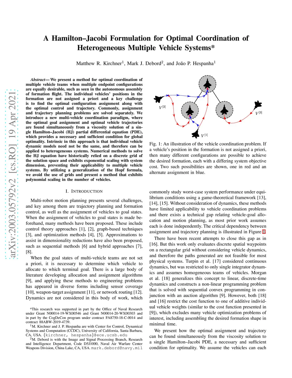 We present a method for optimal coordination of multiple vehicle teams when multiple endpoint configurations are equally desirable, such as seen in the autonomous assembly of formation flight. The individual vehicles' positions in the formation are not assigned a priori and a key challenge is to find the optimal configuration assignment along with the optimal control and trajectory. Commonly, assignment and trajectory planning problems are solved separately. We introduce a new multi-vehicle coordination paradigm, where the optimal goal assignment and optimal vehicle trajectories are found simultaneously from a viscosity solution of a single Hamilton-Jacobi (HJ) partial differential equation (PDE), which provides a necessary and sufficient condition for global optimality. Intrinsic in this approach is that individual vehicle dynamic models need not be the same, and therefore can be applied to heterogeneous systems. Numerical methods to solve the HJ equation have historically relied on a discrete grid of the solution space and exhibits exponential scaling with system dimension, preventing their applicability to multiple vehicle systems. By utilizing a generalization of the Hopf formula, we avoid the use of grids and present a method that exhibits polynomial scaling in the number of vehicles.