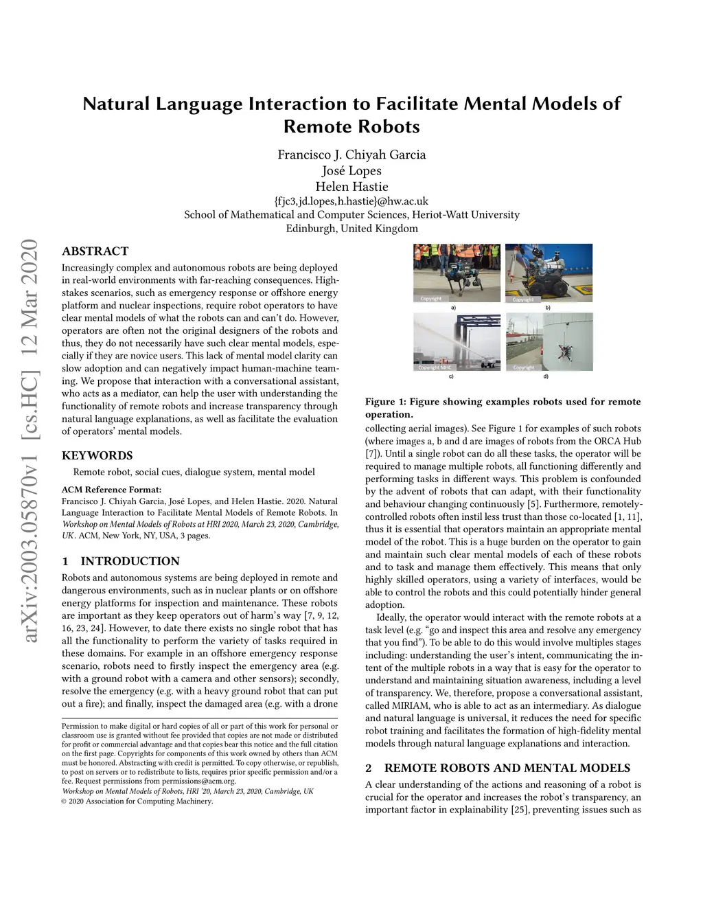 Increasingly complex and autonomous robots are being deployed in real-world environments with far-reaching consequences. High-stakes scenarios, such as emergency response or offshore energy platform and nuclear inspections, require robot operators to have clear mental models of what the robots can and can't do. However, operators are often not the original designers of the robots and thus, they do not necessarily have such clear mental models, especially if they are novice users. This lack of mental model clarity can slow adoption and can negatively impact human-machine teaming. We propose that interaction with a conversational assistant, who acts as a mediator, can help the user with understanding the functionality of remote robots and increase transparency through natural language explanations, as well as facilitate the evaluation of operators' mental models.