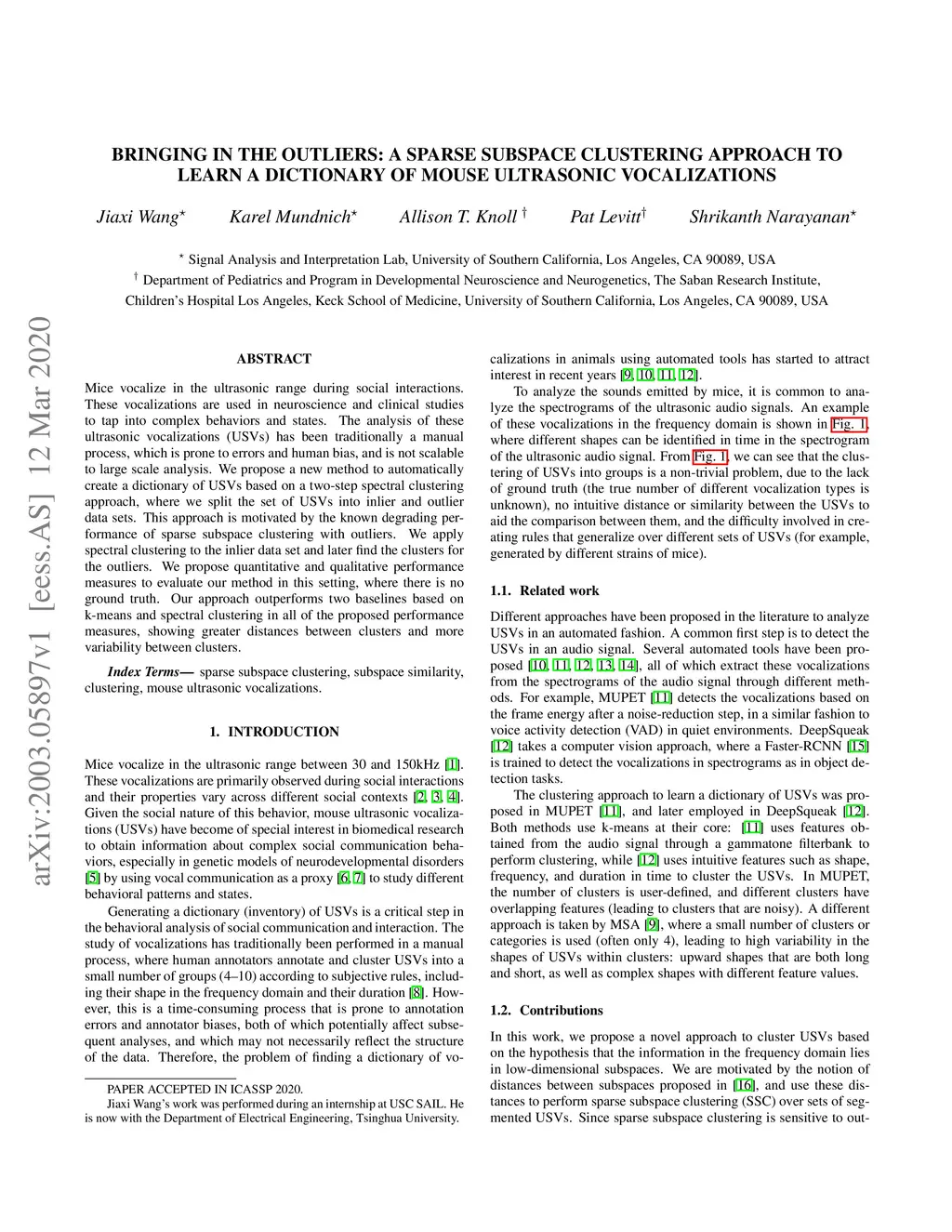 Mice vocalize in the ultrasonic range during social interactions. These vocalizations are used in neuroscience and clinical studies to tap into complex behaviors and states. The analysis of these ultrasonic vocalizations (USVs) has been traditionally a manual process, which is prone to errors and human bias, and is not scalable to large scale analysis. We propose a new method to automatically create a dictionary of USVs based on a two-step spectral clustering approach, where we split the set of USVs into inlier and outlier data sets. This approach is motivated by the known degrading performance of sparse subspace clustering with outliers. We apply spectral clustering to the inlier data set and later find the clusters for the outliers. We propose quantitative and qualitative performance measures to evaluate our method in this setting, where there is no ground truth. Our approach outperforms two baselines based on k-means and spectral clustering in all of the proposed performance measures, showing greater distances between clusters and more variability between clusters.