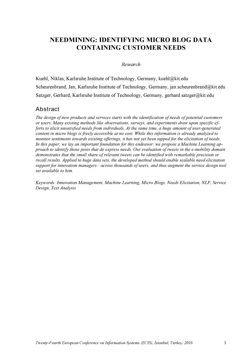 The design of new products and services starts with the identification of needs of potential customers or users. Many existing methods like observations, surveys, and experiments draw upon specific efforts to elicit unsatisfied needs from individuals. At the same time, a huge amount of user-generated content in micro blogs is freely accessible at no cost. While this information is already analyzed to monitor sentiments towards existing offerings, it has not yet been tapped for the elicitation of needs. In this paper, we lay an important foundation for this endeavor: we propose a Machine Learning approach to identify those posts that do express needs. Our evaluation of tweets in the e-mobility domain demonstrates that the small share of relevant tweets can be identified with remarkable precision or recall results. Applied to huge data sets, the developed method should enable scalable need elicitation support for innovation managers - across thousands of users, and thus augment the service design tool set available to him.
