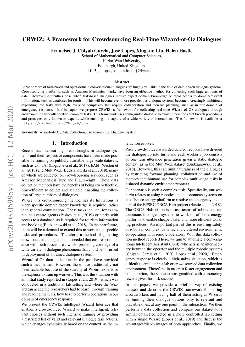 CRWIZ: A Framework for Crowdsourcing Real-Time Wizard-of-Oz Dialogues