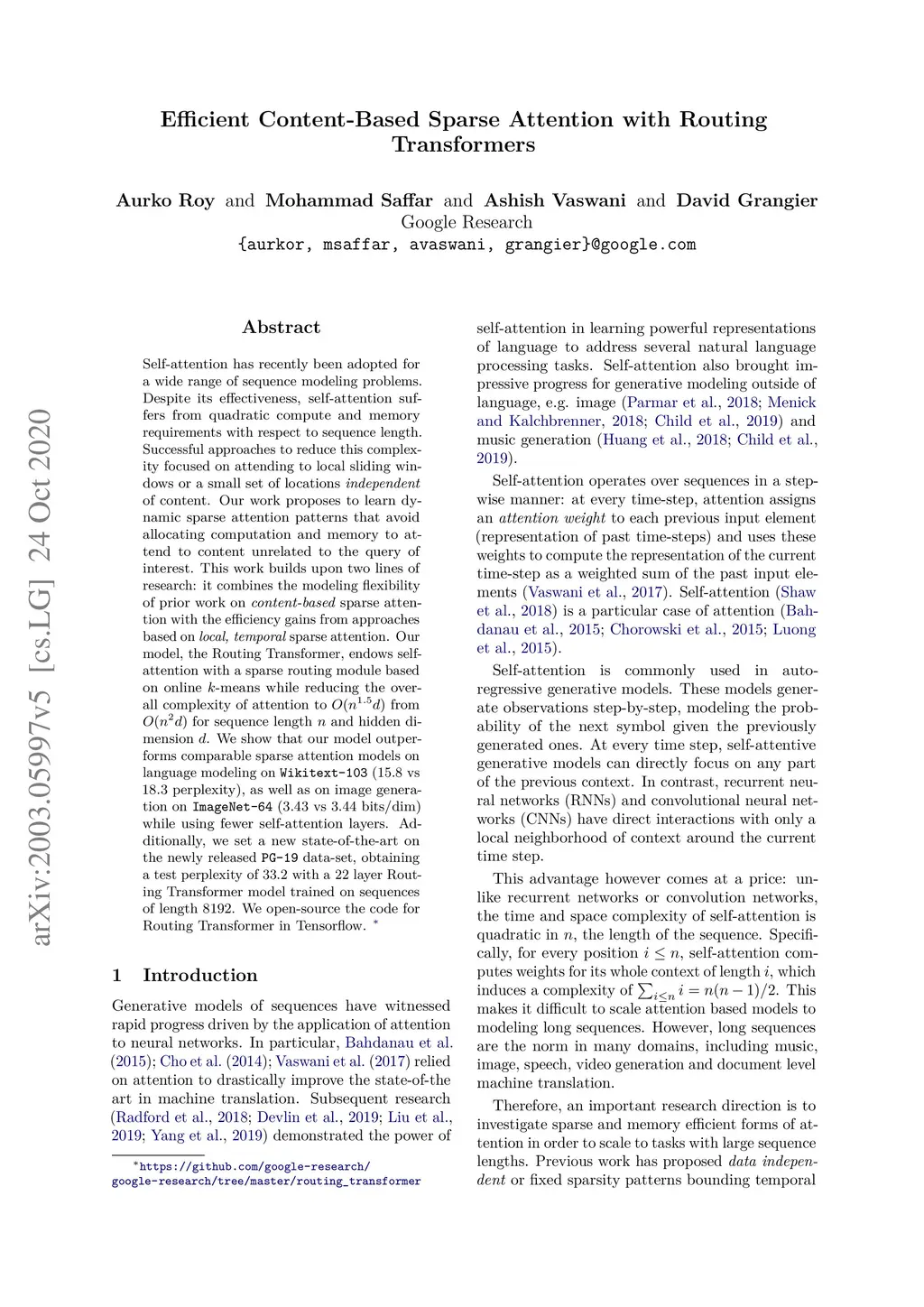 Efficient Content-Based Sparse Attention with Routing Transformers
