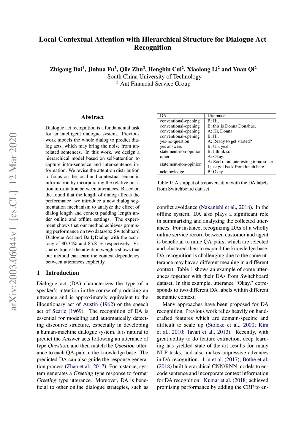 Local Contextual Attention with Hierarchical Structure for Dialogue Act