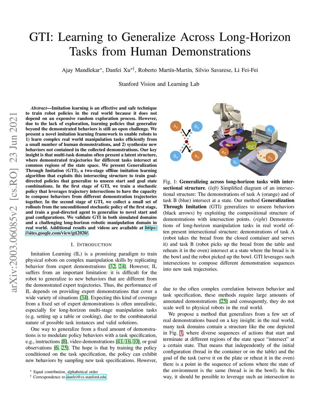 Imitation learning is an effective and safe technique to train robot policies in the real world because it does not depend on an expensive random exploration process. However, due to the lack of exploration, learning policies that generalize beyond the demonstrated behaviors is still an open challenge. We present a novel imitation learning framework to enable robots to 1) learn complex real world manipulation tasks efficiently from a small number of human demonstrations, and 2) synthesize new behaviors not contained in the collected demonstrations. Our key insight is that multi-task domains often present a latent structure, where demonstrated trajectories for different tasks intersect at common regions of the state space. We present Generalization Through Imitation (GTI), a two-stage offline imitation learning algorithm that exploits this intersecting structure to train goal-directed policies that generalize to unseen start and goal state combinations. In the first stage of GTI, we train a stochastic policy that leverages trajectory intersections to have the capacity to compose behaviors from different demonstration trajectories together. In the second stage of GTI, we collect a small set of rollouts from the unconditioned stochastic policy of the first stage, and train a goal-directed agent to generalize to novel start and goal configurations. We validate GTI in both simulated domains and a challenging long-horizon robotic manipulation domain in the real world. Additional results and videos are available at https://sites.google.com/view/gti2020/ .