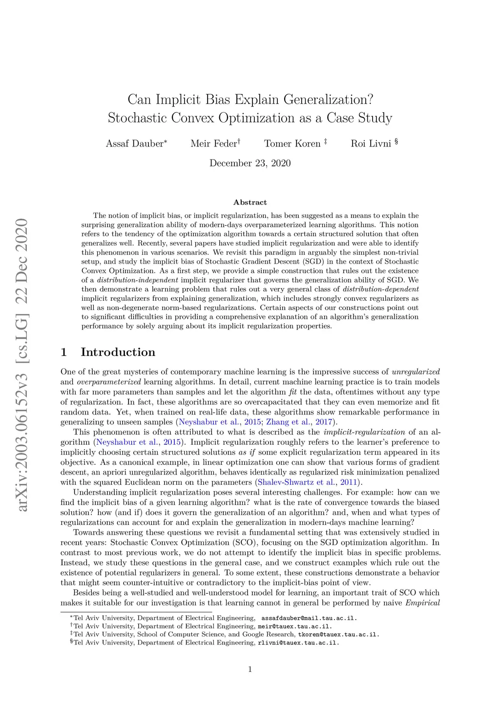 The notion of implicit bias, or implicit regularization, has been suggested as a means to explain the surprising generalization ability of modern-days overparameterized learning algorithms. This notion refers to the tendency of the optimization algorithm towards a certain structured solution that often generalizes well. Recently, several papers have studied implicit regularization and were able to identify this phenomenon in various scenarios. We revisit this paradigm in arguably the simplest non-trivial setup, and study the implicit bias of Stochastic Gradient Descent (SGD) in the context of Stochastic Convex Optimization. As a first step, we provide a simple construction that rules out the existence of a \emph{distribution-independent} implicit regularizer that governs the generalization ability of SGD. We then demonstrate a learning problem that rules out a very general class of \emph{distribution-dependent} implicit regularizers from explaining generalization, which includes strongly convex regularizers as well as non-degenerate norm-based regularizations. Certain aspects of our constructions point out to significant difficulties in providing a comprehensive explanation of an algorithm's generalization performance by solely arguing about its implicit regularization properties.