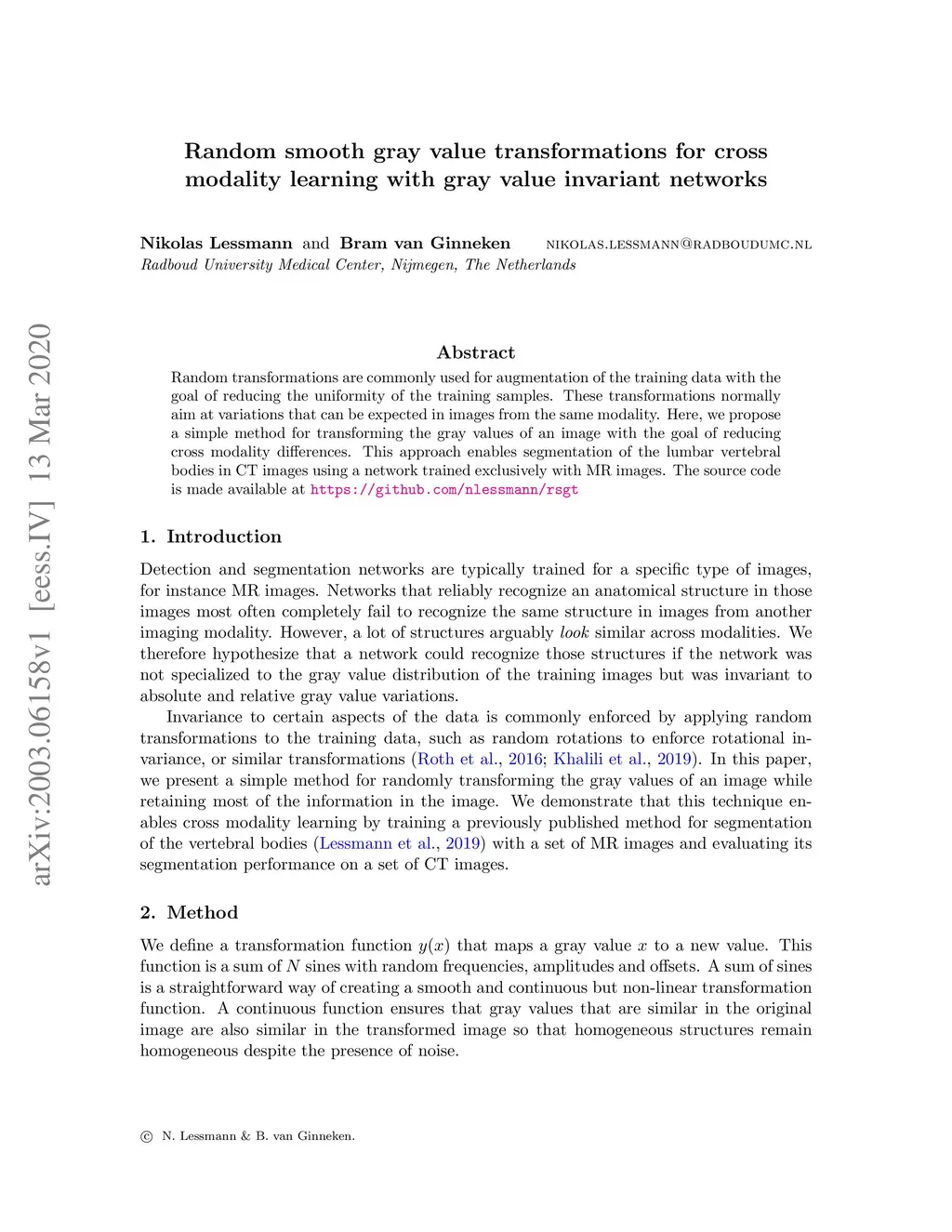 Random transformations are commonly used for augmentation of the training data with the goal of reducing the uniformity of the training samples. These transformations normally aim at variations that can be expected in images from the same modality. Here, we propose a simple method for transforming the gray values of an image with the goal of reducing cross modality differences. This approach enables segmentation of the lumbar vertebral bodies in CT images using a network trained exclusively with MR images. The source code is made available at https://github.com/nlessmann/rsgt