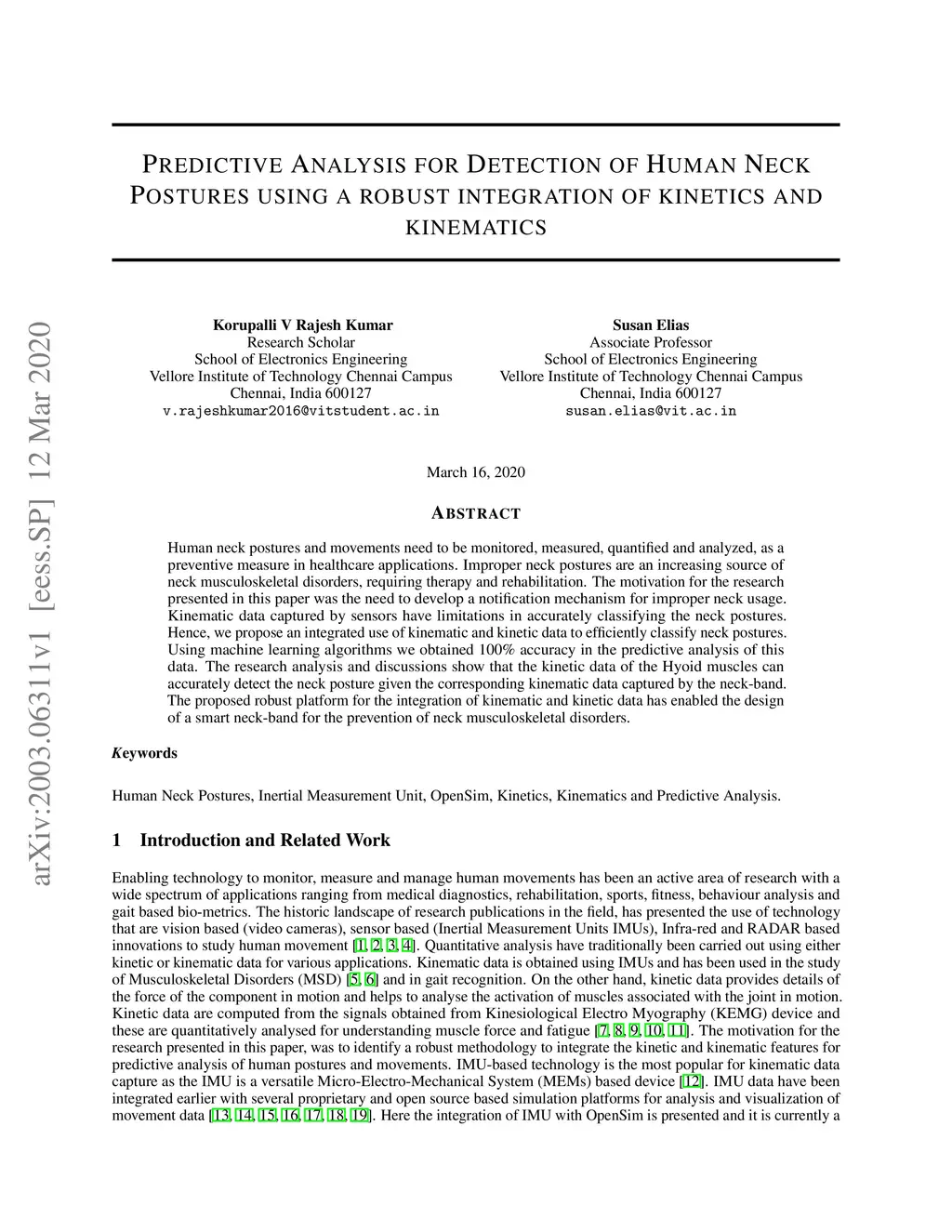 Human neck postures and movements need to be monitored, measured, quantified and analyzed, as a preventive measure in healthcare applications. Improper neck postures are an increasing source of neck musculoskeletal disorders, requiring therapy and rehabilitation. The motivation for the research presented in this paper was the need to develop a notification mechanism for improper neck usage. Kinematic data captured by sensors have limitations in accurately classifying the neck postures. Hence, we propose an integrated use of kinematic and kinetic data to efficiently classify neck postures. Using machine learning algorithms we obtained 100% accuracy in the predictive analysis of this data. The research analysis and discussions show that the kinetic data of the Hyoid muscles can accurately detect the neck posture given the corresponding kinematic data captured by the neck-band. The proposed robust platform for the integration of kinematic and kinetic data has enabled the design of a smart neck-band for the prevention of neck musculoskeletal disorders.