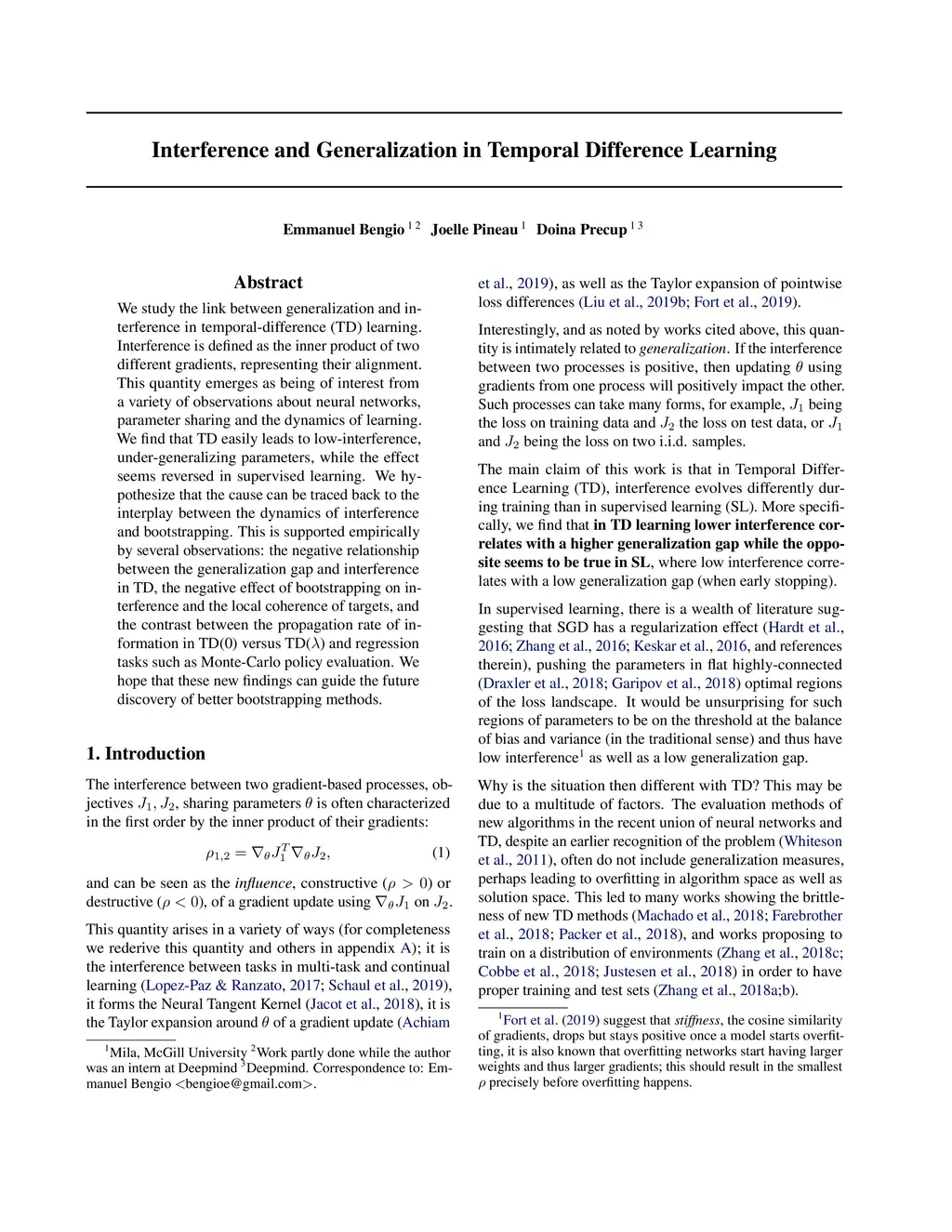 We study the link between generalization and interference in temporal-difference (TD) learning. Interference is defined as the inner product of two different gradients, representing their alignment. This quantity emerges as being of interest from a variety of observations about neural networks, parameter sharing and the dynamics of learning. We find that TD easily leads to low-interference, under-generalizing parameters, while the effect seems reversed in supervised learning. We hypothesize that the cause can be traced back to the interplay between the dynamics of interference and bootstrapping. This is supported empirically by several observations: the negative relationship between the generalization gap and interference in TD, the negative effect of bootstrapping on interference and the local coherence of targets, and the contrast between the propagation rate of information in TD(0) versus TD() and regression tasks such as Monte-Carlo policy evaluation. We hope that these new findings can guide the future discovery of better bootstrapping methods.
