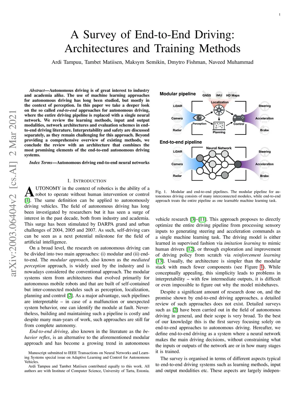 Autonomous driving is of great interest to industry and academia alike. The use of machine learning approaches for autonomous driving has long been studied, but mostly in the context of perception. In this paper we take a deeper look on the so called end-to-end approaches for autonomous driving, where the entire driving pipeline is replaced with a single neural network. We review the learning methods, input and output modalities, network architectures and evaluation schemes in end-to-end driving literature. Interpretability and safety are discussed separately, as they remain challenging for this approach. Beyond providing a comprehensive overview of existing methods, we conclude the review with an architecture that combines the most promising elements of the end-to-end autonomous driving systems.