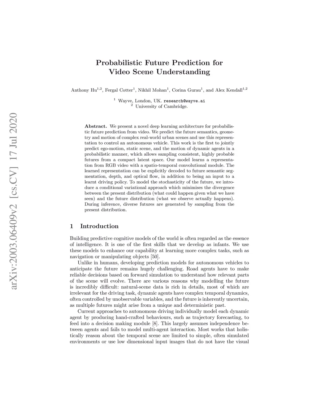 We present a novel deep learning architecture for probabilistic future prediction from video. We predict the future semantics, geometry and motion of complex real-world urban scenes and use this representation to control an autonomous vehicle. This work is the first to jointly predict ego-motion, static scene, and the motion of dynamic agents in a probabilistic manner, which allows sampling consistent, highly probable futures from a compact latent space. Our model learns a representation from RGB video with a spatio-temporal convolutional module. The learned representation can be explicitly decoded to future semantic segmentation, depth, and optical flow, in addition to being an input to a learnt driving policy. To model the stochasticity of the future, we introduce a conditional variational approach which minimises the divergence between the present distribution (what could happen given what we have seen) and the future distribution (what we observe actually happens). During inference, diverse futures are generated by sampling from the present distribution.