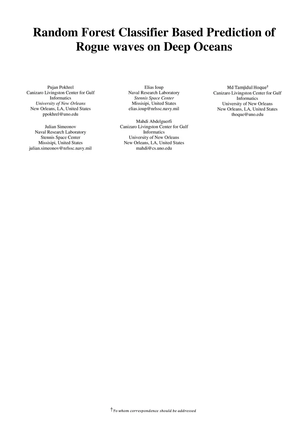 Random Forest Classifier Based Prediction of Rogue waves on Deep Oceans