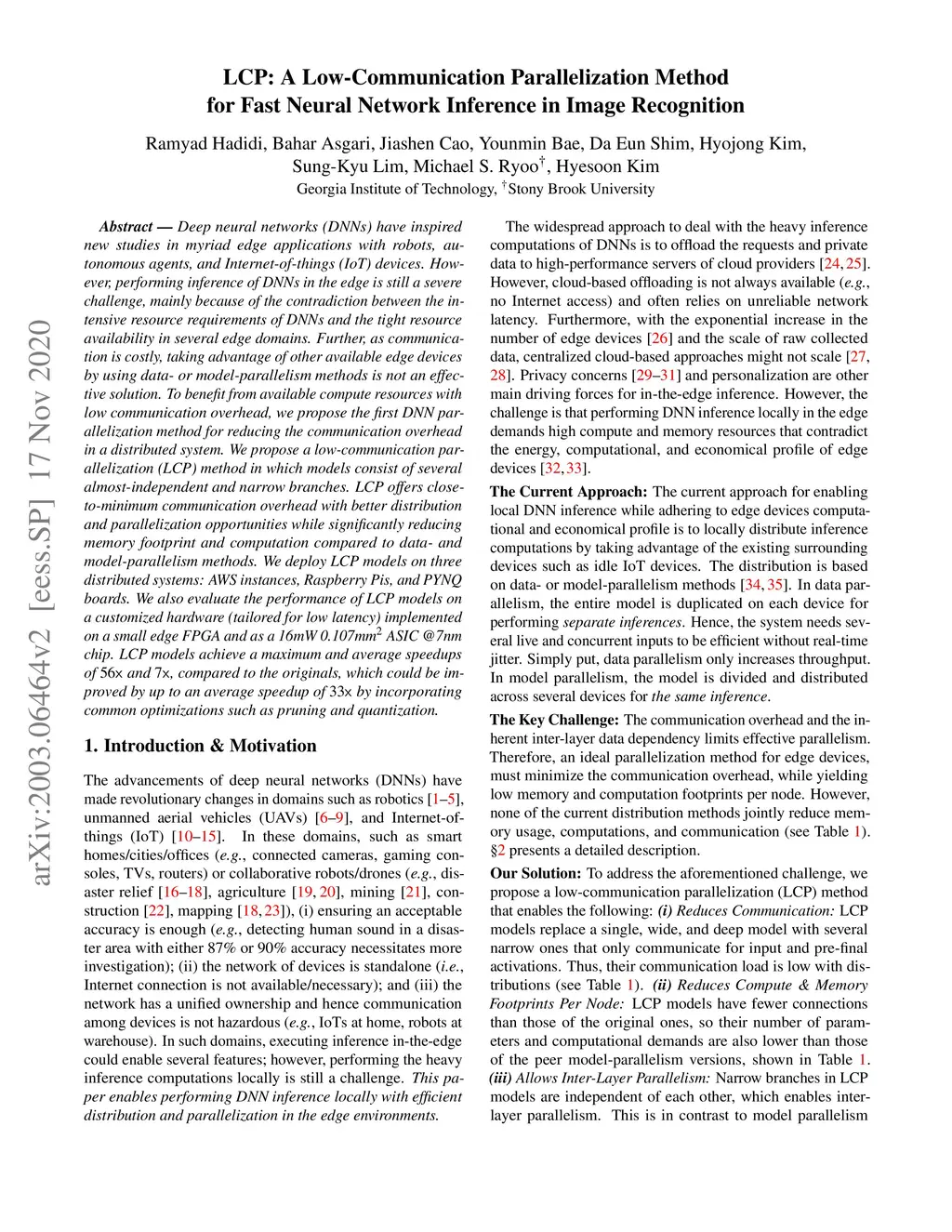 Deep neural networks (DNNs) have inspired new studies in myriad edge applications with robots, autonomous agents, and Internet-of-things (IoT) devices. However, performing inference of DNNs in the edge is still a severe challenge, mainly because of the contradiction between the intensive resource requirements of DNNs and the tight resource availability in several edge domains. Further, as communication is costly, taking advantage of other available edge devices by using data- or model-parallelism methods is not an effective solution. To benefit from available compute resources with low communication overhead, we propose the first DNN parallelization method for reducing the communication overhead in a distributed system. We propose a low-communication parallelization (LCP) method in which models consist of several almost-independent and narrow branches. LCP offers close-to-minimum communication overhead with better distribution and parallelization opportunities while significantly reducing memory footprint and computation compared to data- and model-parallelism methods. We deploy LCP models on three distributed systems: AWS instances, Raspberry Pis, and PYNQ boards. We also evaluate the performance of LCP models on a customized hardware (tailored for low latency) implemented on a small edge FPGA and as a 16mW 0.107mm2 ASIC @7nm chip. LCP models achieve a maximum and average speedups of 56x and 7x, compared to the originals, which could be improved by up to an average speedup of 33x by incorporating common optimizations such as pruning and quantization.
