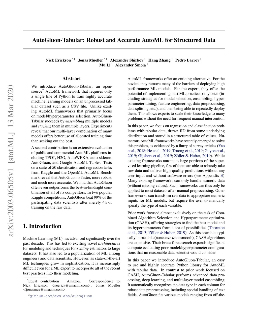 We introduce AutoGluon-Tabular, an open-source AutoML framework that requires only a single line of Python to train highly accurate machine learning models on an unprocessed tabular dataset such as a CSV file. Unlike existing AutoML frameworks that primarily focus on model/hyperparameter selection, AutoGluon-Tabular succeeds by ensembling multiple models and stacking them in multiple layers. Experiments reveal that our multi-layer combination of many models offers better use of allocated training time than seeking out the best. A second contribution is an extensive evaluation of public and commercial AutoML platforms including TPOT, H2O, AutoWEKA, auto-sklearn, AutoGluon, and Google AutoML Tables. Tests on a suite of 50 classification and regression tasks from Kaggle and the OpenML AutoML Benchmark reveal that AutoGluon is faster, more robust, and much more accurate. We find that AutoGluon often even outperforms the best-in-hindsight combination of all of its competitors. In two popular Kaggle competitions, AutoGluon beat 99% of the participating data scientists after merely 4h of training on the raw data.