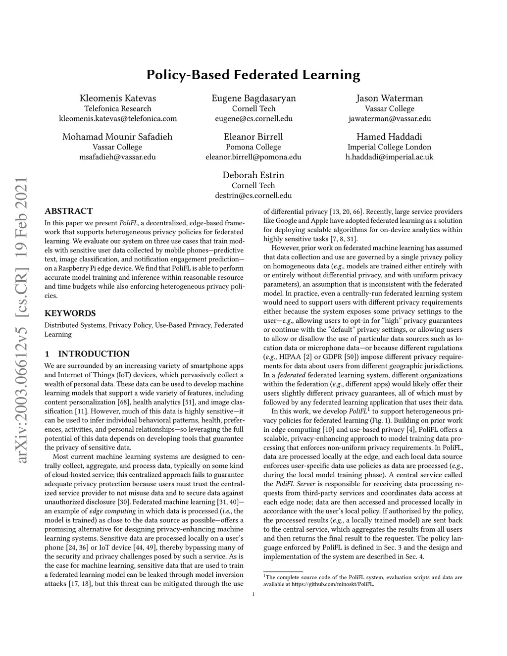 In this paper we present PoliFL, a decentralized, edge-based framework that supports heterogeneous privacy policies for federated learning. We evaluate our system on three use cases that train models with sensitive user data collected by mobile phones - predictive text, image classification, and notification engagement prediction - on a Raspberry Pi edge device. We find that PoliFL is able to perform accurate model training and inference within reasonable resource and time budgets while also enforcing heterogeneous privacy policies.