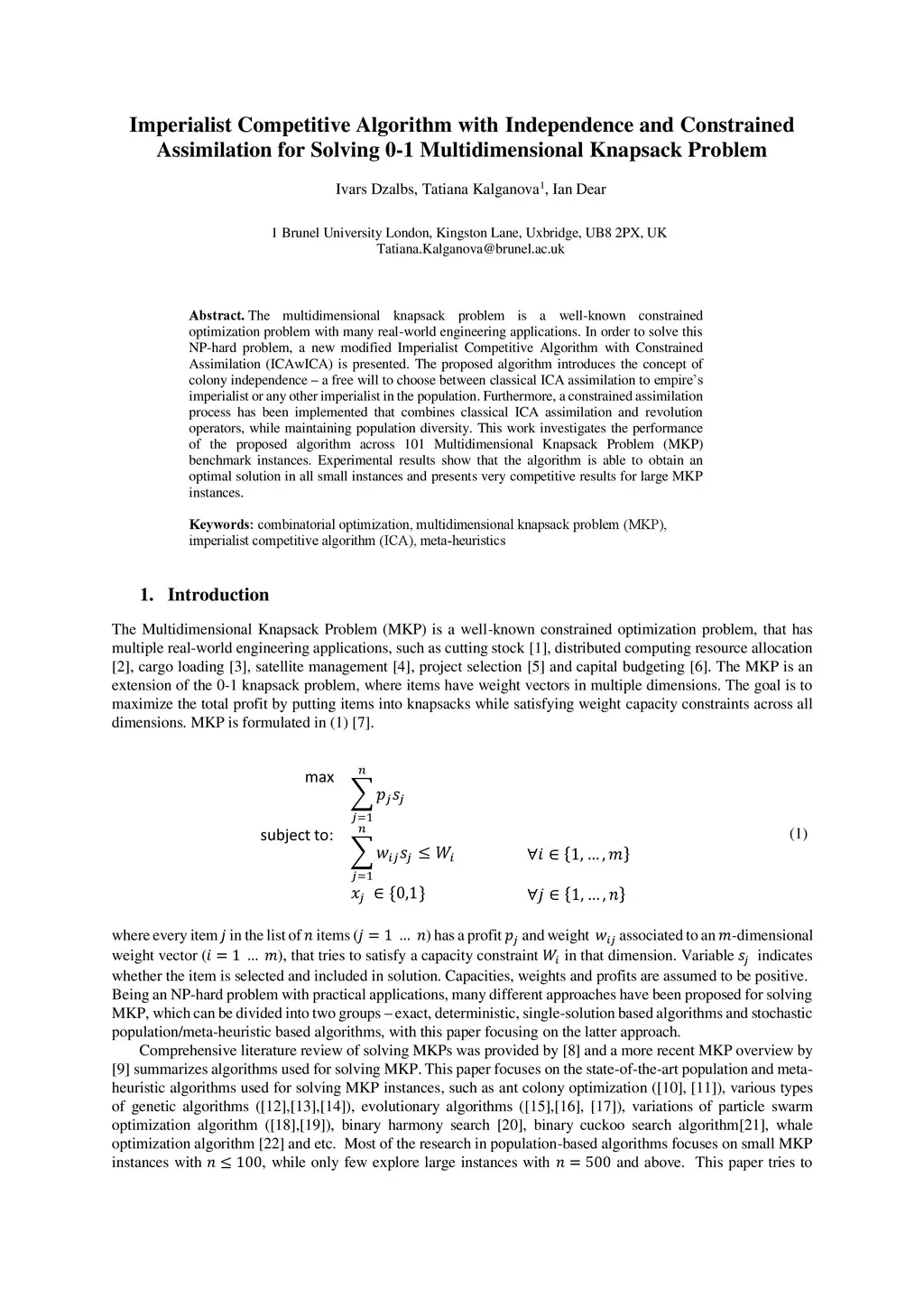 The multidimensional knapsack problem is a well-known constrained optimization problem with many real-world engineering applications. In order to solve this NP-hard problem, a new modified Imperialist Competitive Algorithm with Constrained Assimilation (ICAwICA) is presented. The proposed algorithm introduces the concept of colony independence, a free will to choose between classical ICA assimilation to empires imperialist or any other imperialist in the population. Furthermore, a constrained assimilation process has been implemented that combines classical ICA assimilation and revolution operators, while maintaining population diversity. This work investigates the performance of the proposed algorithm across 101 Multidimensional Knapsack Problem (MKP) benchmark instances. Experimental results show that the algorithm is able to obtain an optimal solution in all small instances and presents very competitive results for large MKP instances.