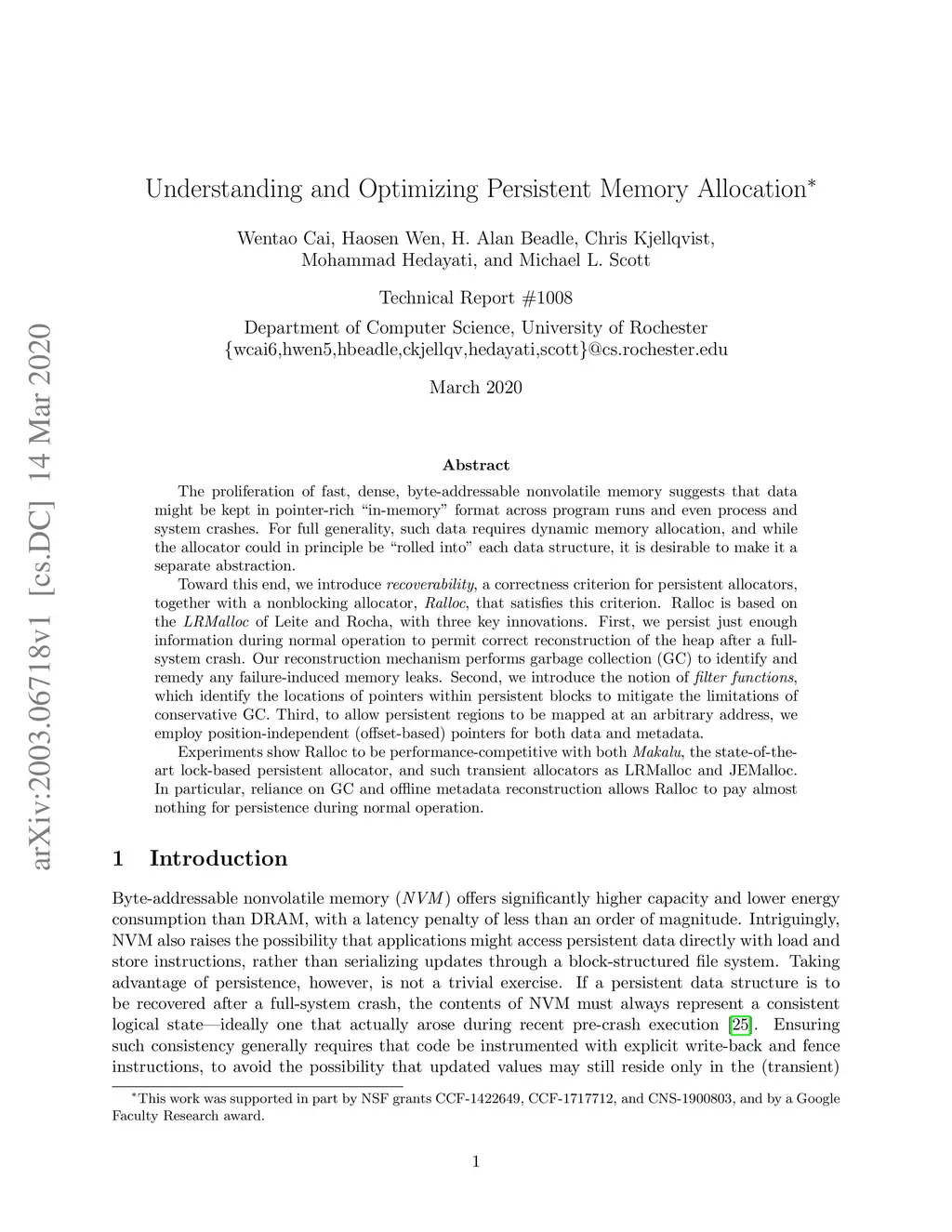 The proliferation of fast, dense, byte-addressable nonvolatile memory suggests that data might be kept in pointer-rich "in-memory" format across program runs and even process and system crashes. For full generality, such data requires dynamic memory allocation, and while the allocator could in principle "rolled into" each data structure, it is desirable to make it a separate abstraction. Toward this end, we introduce recoverability, a correctness criterion for persistent allocators, together with a nonblocking allocator, Ralloc, that satisfies this criterion. Ralloc is based on the LRMalloc of Leite and Rocha, with three key innovations. First, we persist just enough information during normal operation to permit correct reconstruction of the heap after a full-system crash. Our reconstruction mechanism performs garbage collection (GC) to identify and remedy any failure-induced memory leaks. Second, we introduce the notion of filter functions, which identify the locations of pointers within persistent blocks to mitigate the limitations of conservative GC. Third, to allow persistent regions to be mapped at an arbitrary address, we employ position-independent (offset-based) pointers for both data and metadata. Experiments show Ralloc to be performance-competitive with both Makalu, the state-of-the-art lock-based persistent allocator, and such transient allocators as LRMalloc and JEMalloc. In particular, reliance on GC and offline metadata reconstruction allows Ralloc to pay almost nothing for persistence during normal operation.