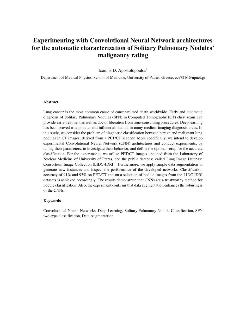 Lung Cancer is the most common cause of cancer-related death worldwide. Early and automatic diagnosis of Solitary Pulmonary Nodules (SPN) in Computer Tomography (CT) chest scans can provide early treatment as well as doctor liberation from time-consuming procedures. Deep Learning has been proven as a popular and influential method in many medical imaging diagnosis areas. In this study, we consider the problem of diagnostic classification between benign and malignant lung nodules in CT images derived from a PET/CT scanner. More specifically, we intend to develop experimental Convolutional Neural Network (CNN) architectures and conduct experiments, by tuning their parameters, to investigate their behavior, and to define the optimal setup for the accurate classification. For the experiments, we utilize PET/CT images obtained from the Laboratory of Nuclear Medicine of the University of Patras, and the publically available database called Lung Image Database Consortium Image Collection (LIDC-IDRI). Furthermore, we apply simple data augmentation to generate new instances and to inspect the performance of the developed networks. Classification accuracy of 91% and 93% on the PET/CT dataset and on a selection of nodule images form the LIDC-IDRI dataset, is achieved accordingly. The results demonstrate that CNNs are a trustworth method for nodule classification. Also, the experiment confirms that data augmentation enhances the robustness of the CNNs.