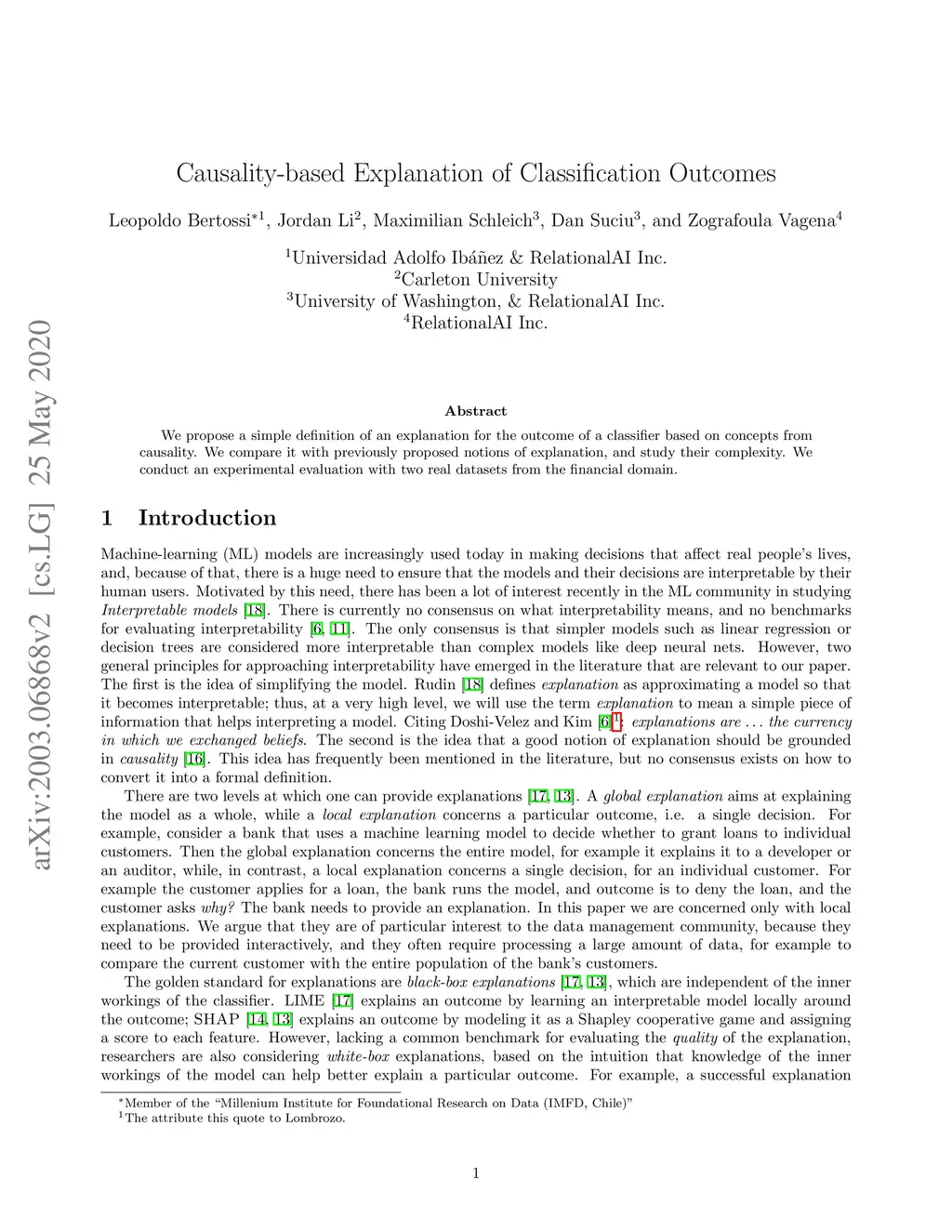 We propose a simple definition of an explanation for the outcome of a classifier based on concepts from causality. We compare it with previously proposed notions of explanation, and study their complexity. We conduct an experimental evaluation with two real datasets from the financial domain.