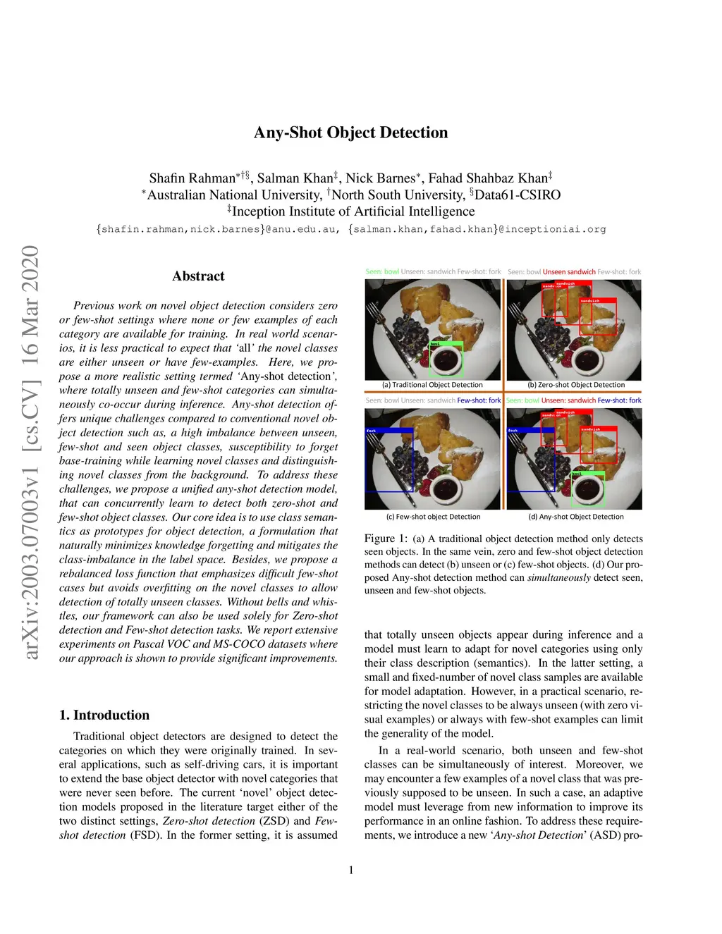 Previous work on novel object detection considers zero or few-shot settings where none or few examples of each category are available for training. In real world scenarios, it is less practical to expect that áll' the novel classes are either unseen or {have} few-examples. Here, we propose a more realistic setting termed Ány-shot detection', where totally unseen and few-shot categories can simultaneously co-occur during inference. Any-shot detection offers unique challenges compared to conventional novel object detection such as, a high imbalance between unseen, few-shot and seen object classes, susceptibility to forget base-training while learning novel classes and distinguishing novel classes from the background. To address these challenges, we propose a unified any-shot detection model, that can concurrently learn to detect both zero-shot and few-shot object classes. Our core idea is to use class semantics as prototypes for object detection, a formulation that naturally minimizes knowledge forgetting and mitigates the class-imbalance in the label space. Besides, we propose a rebalanced loss function that emphasizes difficult few-shot cases but avoids overfitting on the novel classes to allow detection of totally unseen classes. Without bells and whistles, our framework can also be used solely for Zero-shot detection and Few-shot detection tasks. We report extensive experiments on Pascal VOC and MS-COCO datasets where our approach is shown to provide significant improvements.