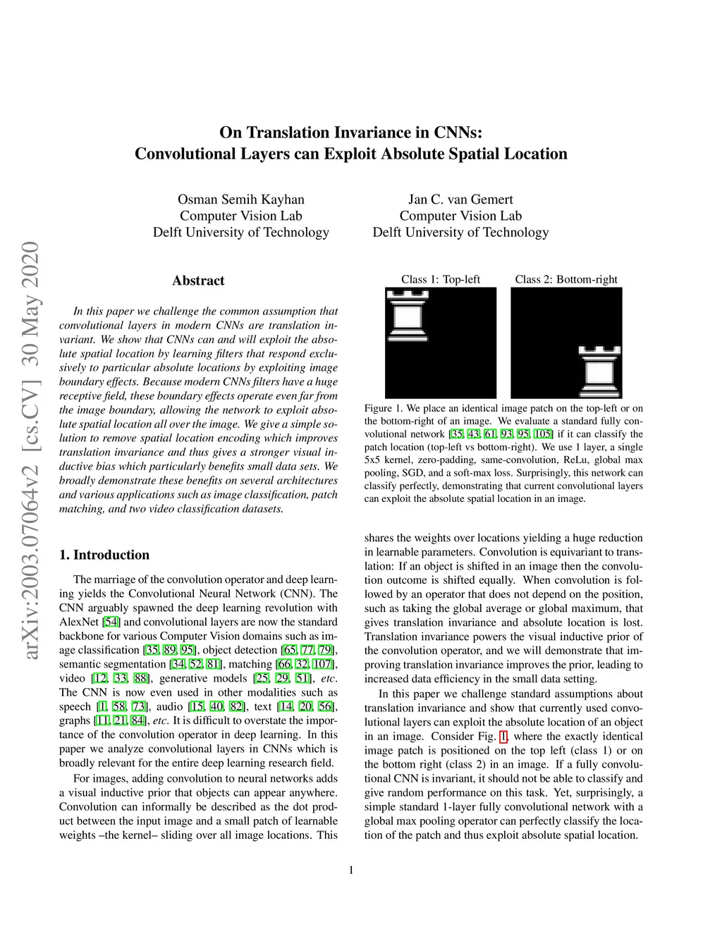 In this paper we challenge the common assumption that convolutional layers in modern CNNs are translation invariant. We show that CNNs can and will exploit the absolute spatial location by learning filters that respond exclusively to particular absolute locations by exploiting image boundary effects. Because modern CNNs filters have a huge receptive field, these boundary effects operate even far from the image boundary, allowing the network to exploit absolute spatial location all over the image. We give a simple solution to remove spatial location encoding which improves translation invariance and thus gives a stronger visual inductive bias which particularly benefits small data sets. We broadly demonstrate these benefits on several architectures and various applications such as image classification, patch matching, and two video classification datasets.