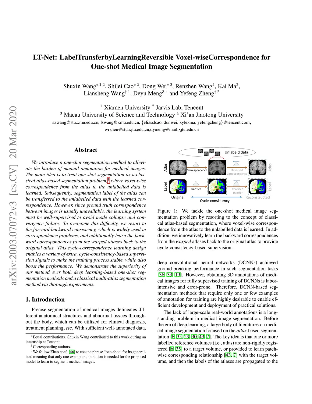 LT-Net: Label Transfer by Learning Reversible Voxel-wise Correspondence