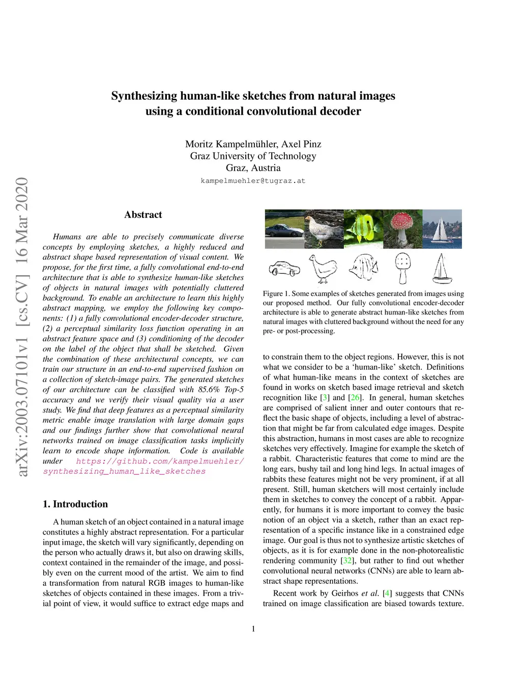 Humans are able to precisely communicate diverse concepts by employing sketches, a highly reduced and abstract shape based representation of visual content. We propose, for the first time, a fully convolutional end-to-end architecture that is able to synthesize human-like sketches of objects in natural images with potentially cluttered background. To enable an architecture to learn this highly abstract mapping, we employ the following key components: (1) a fully convolutional encoder-decoder structure, (2) a perceptual similarity loss function operating in an abstract feature space and (3) conditioning of the decoder on the label of the object that shall be sketched. Given the combination of these architectural concepts, we can train our structure in an end-to-end supervised fashion on a collection of sketch-image pairs. The generated sketches of our architecture can be classified with 85.6% Top-5 accuracy and we verify their visual quality via a user study. We find that deep features as a perceptual similarity metric enable image translation with large domain gaps and our findings further show that convolutional neural networks trained on image classification tasks implicitly learn to encode shape information. Code is available under https://github.com/kampelmuehler/synthesizing_human_like_sketches