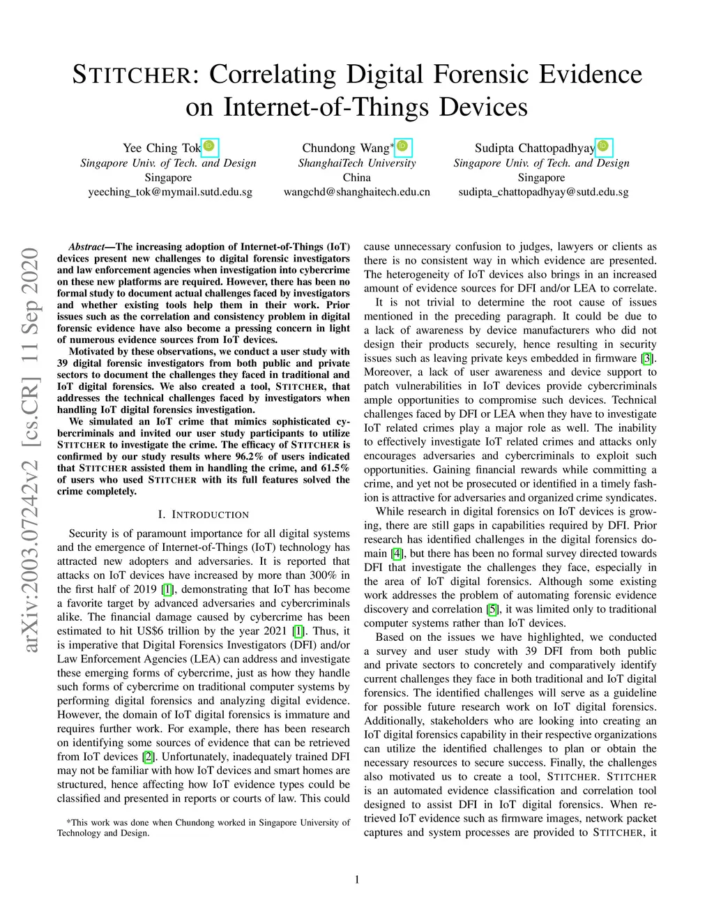 The increasing adoption of Internet-of-Things (IoT) devices present new challenges to digital forensic investigators and law enforcement agencies when investigation into cybercrime on these new platforms are required. However, there has been no formal study to document actual challenges faced by investigators and whether existing tools help them in their work. Prior issues such as the correlation and consistency problem in digital forensic evidence have also become a pressing concern in light of numerous evidence sources from IoT devices. Motivated by these observations, we conduct a user study with 39 digital forensic investigators from both public and private sectors to document the challenges they faced in traditional and IoT digital forensics. We also created a tool, STITCHER, that addresses the technical challenges faced by investigators when handling IoT digital forensics investigation. We simulated an IoT crime that mimics sophisticated cybercriminals and invited our user study participants to utilize STITCHER to investigate the crime. The efficacy of STITCHER is confirmed by our study results where 96.2% of users indicated that STITCHER assisted them in handling the crime, and 61.5% of users who used STITCHER with its full features solved the crime completely.