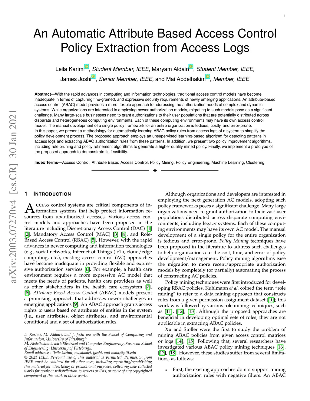 With the rapid advances in computing and information technologies, traditional access control models have become inadequate in terms of capturing fine-grained, and expressive security requirements of newly emerging applications. An attribute-based access control (ABAC) model provides a more flexible approach for addressing the authorization needs of complex and dynamic systems. While organizations are interested in employing newer authorization models, migrating to such models pose as a significant challenge. Many large-scale businesses need to grant authorization to their user populations that are potentially distributed across disparate and heterogeneous computing environments. Each of these computing environments may have its own access control model. The manual development of a single policy framework for an entire organization is tedious, costly, and error-prone. In this paper, we present a methodology for automatically learning ABAC policy rules from access logs of a system to simplify the policy development process. The proposed approach employs an unsupervised learning-based algorithm for detecting patterns in access logs and extracting ABAC authorization rules from these patterns. In addition, we present two policy improvement algorithms, including rule pruning and policy refinement algorithms to generate a higher quality mined policy. Finally, we implement a prototype of the proposed approach to demonstrate its feasibility.