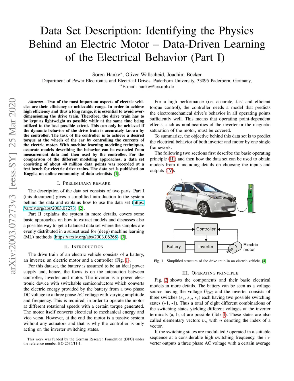 Two of the most important aspects of electric vehicles are their efficiency or achievable range. In order to achieve high efficiency and thus a long range, it is essential to avoid over-dimensioning the drive train. Therefore, the drive train has to be kept as lightweight as possible while at the same time being utilized to the best possible extent. This can only be achieved if the dynamic behavior of the drive train is accurately known by the controller. The task of the controller is to achieve a desired torque at the wheels of the car by controlling the currents of the electric motor. With machine learning modeling techniques, accurate models describing the behavior can be extracted from measurement data and then used by the controller. For the comparison of the different modeling approaches, a data set consisting of about 40 million data points was recorded at a test bench for electric drive trains. The data set is published on Kaggle, an online community of data scientists.